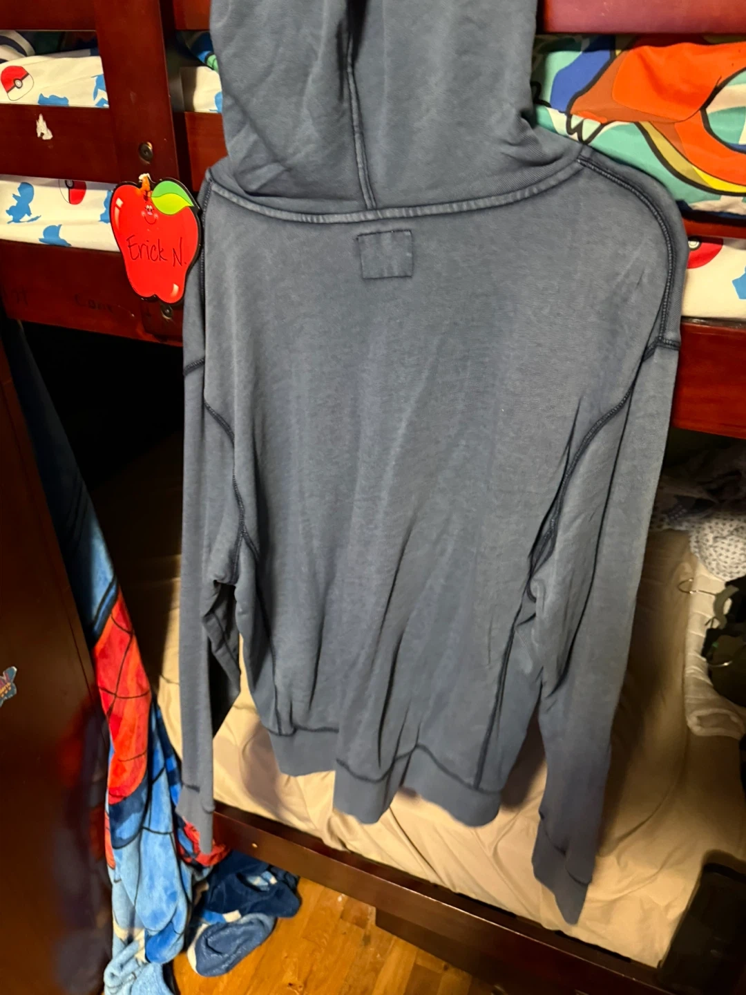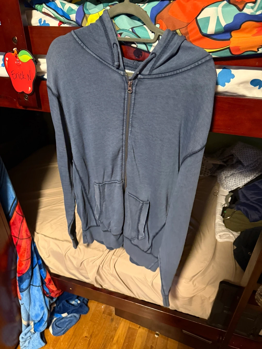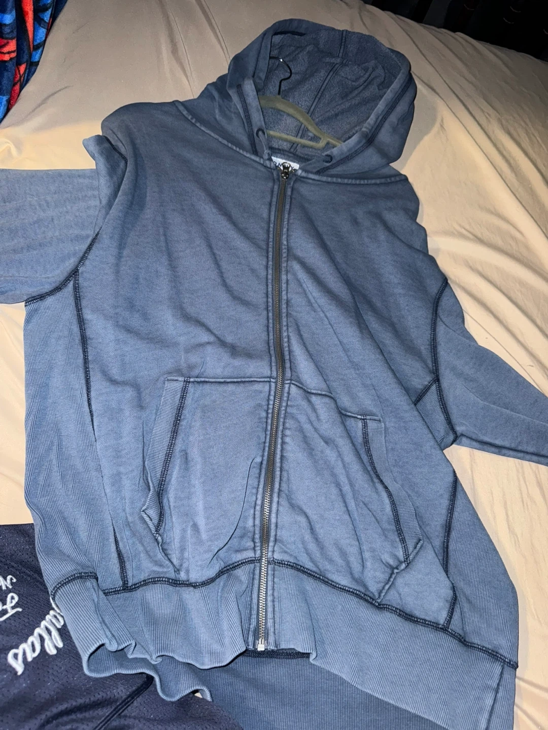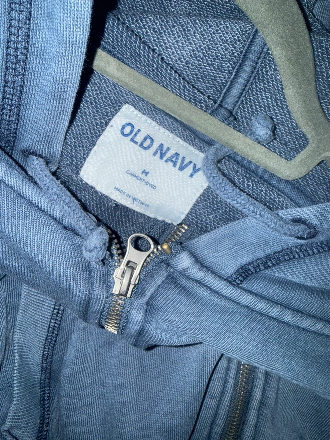 This is a blue Old Navy zip-up hoodie. It's a size medium and garment-dyed. It features a full zip front and front pockets.