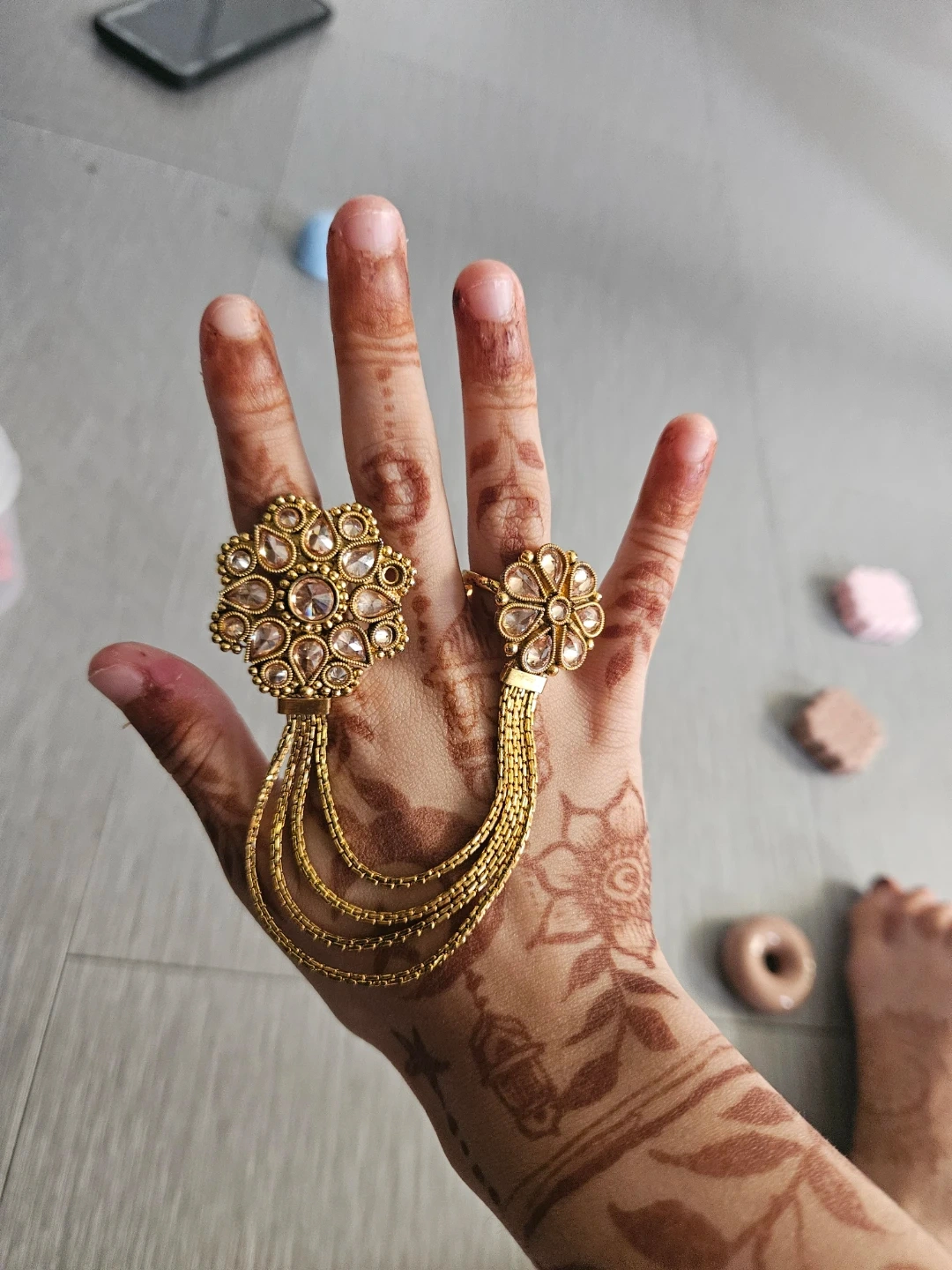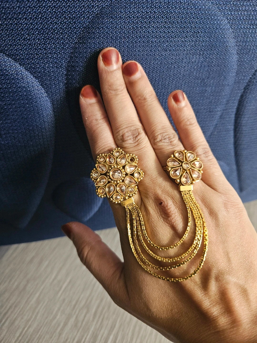 This stunning gold-tone ring bracelet features intricate floral designs embellished with clear rhinestones. It's connected by delicate gold chains, designed to be worn across the hand. Perfect for adding a touch of sparkle to any special occasion outfit!