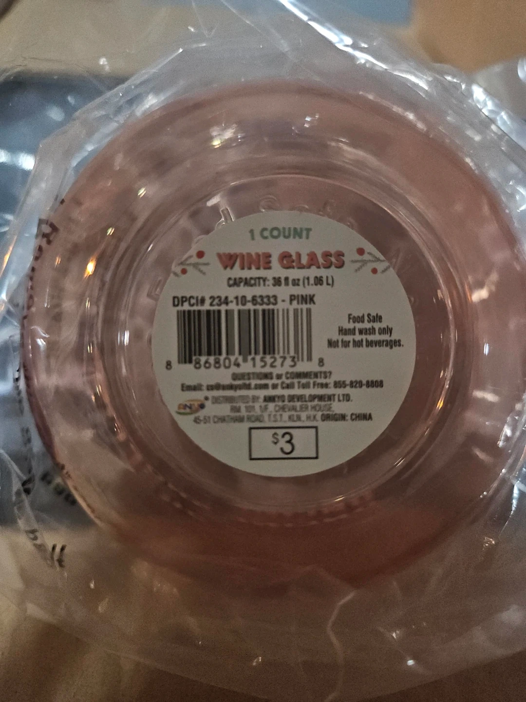 This is a large wine glass, holding 36 oz (1.06 L). It's pink and clear and made for hand washing only. It's not suitable for hot beverages.