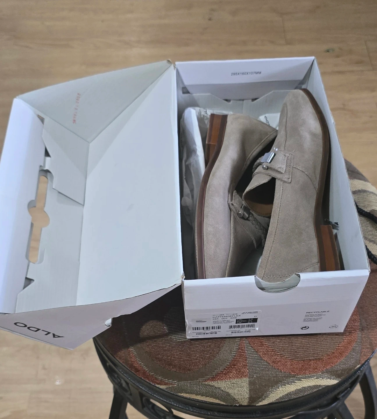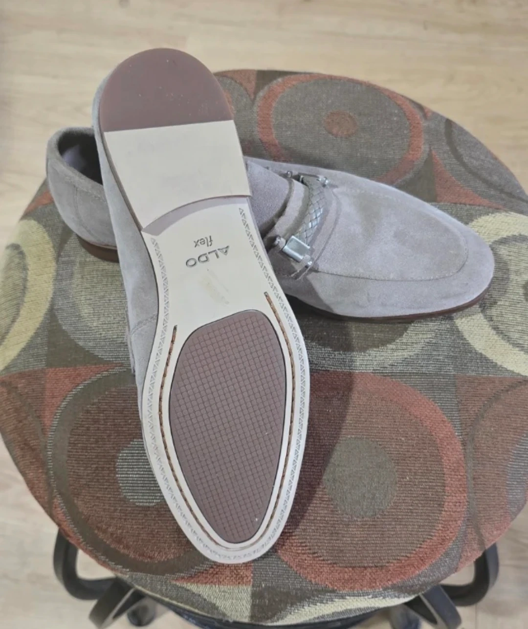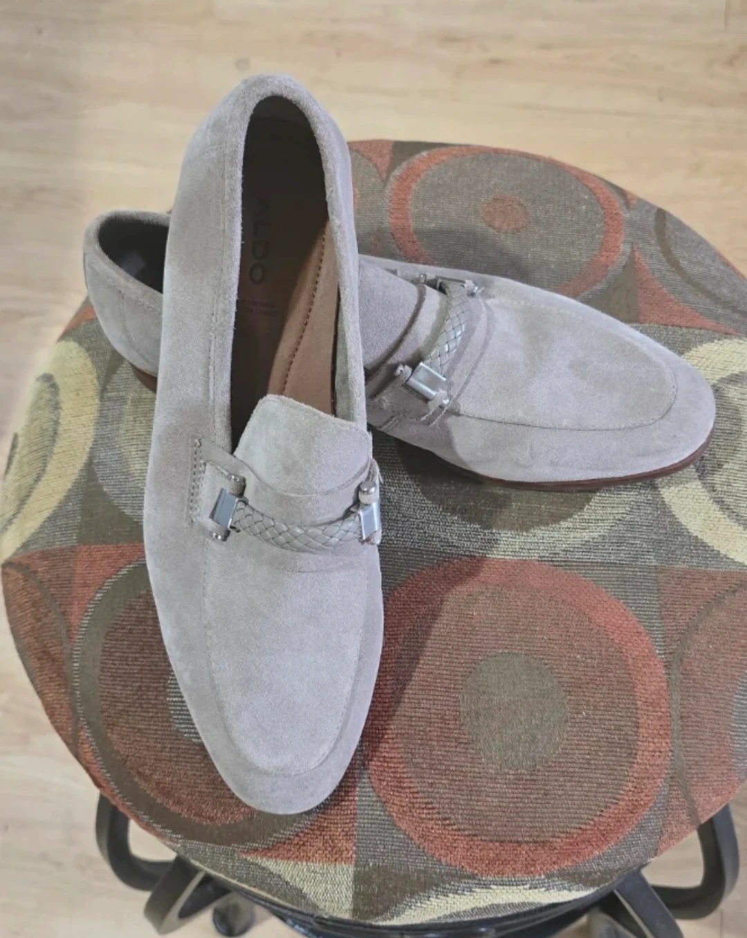 These ALDO loafers are crafted from taupe suede. They feature a decorative metal buckle with braided detail across the vamp. The soles are man-made.