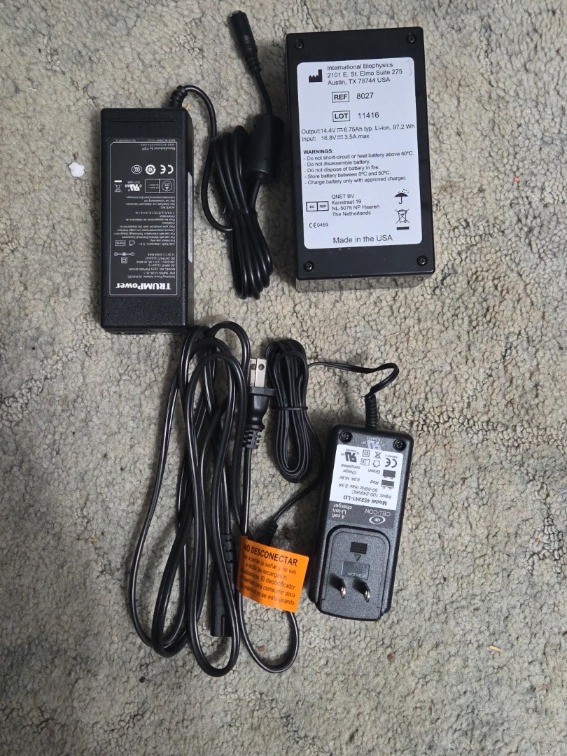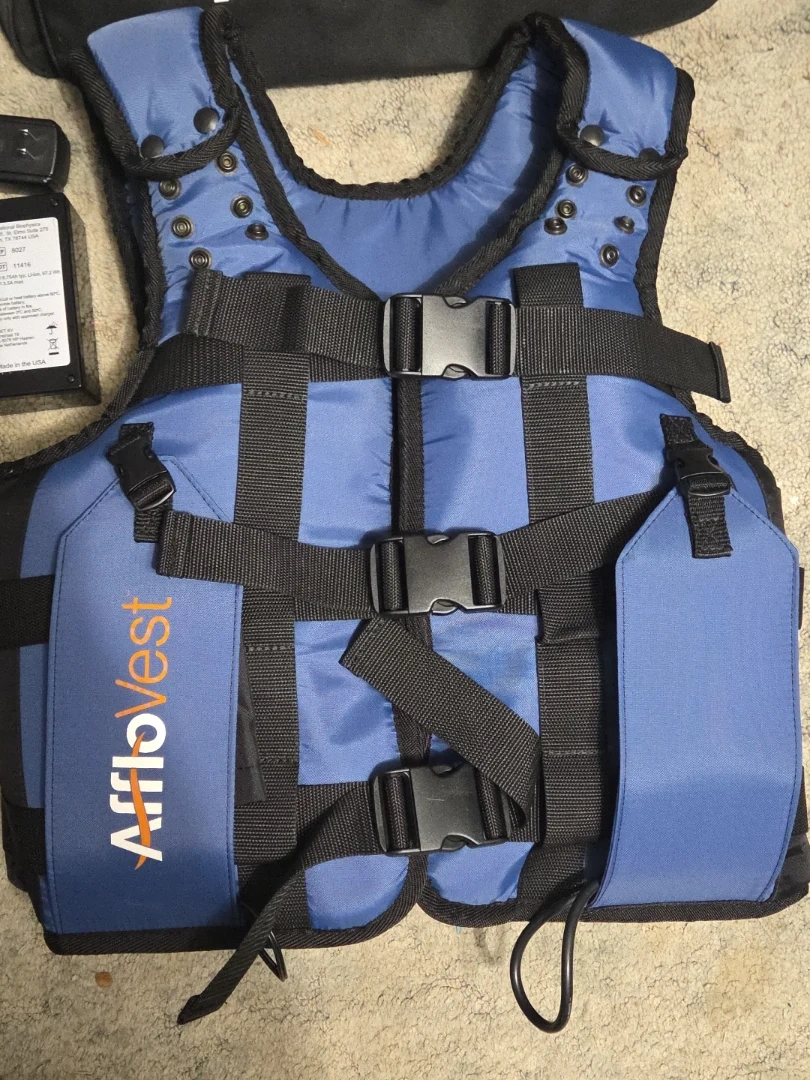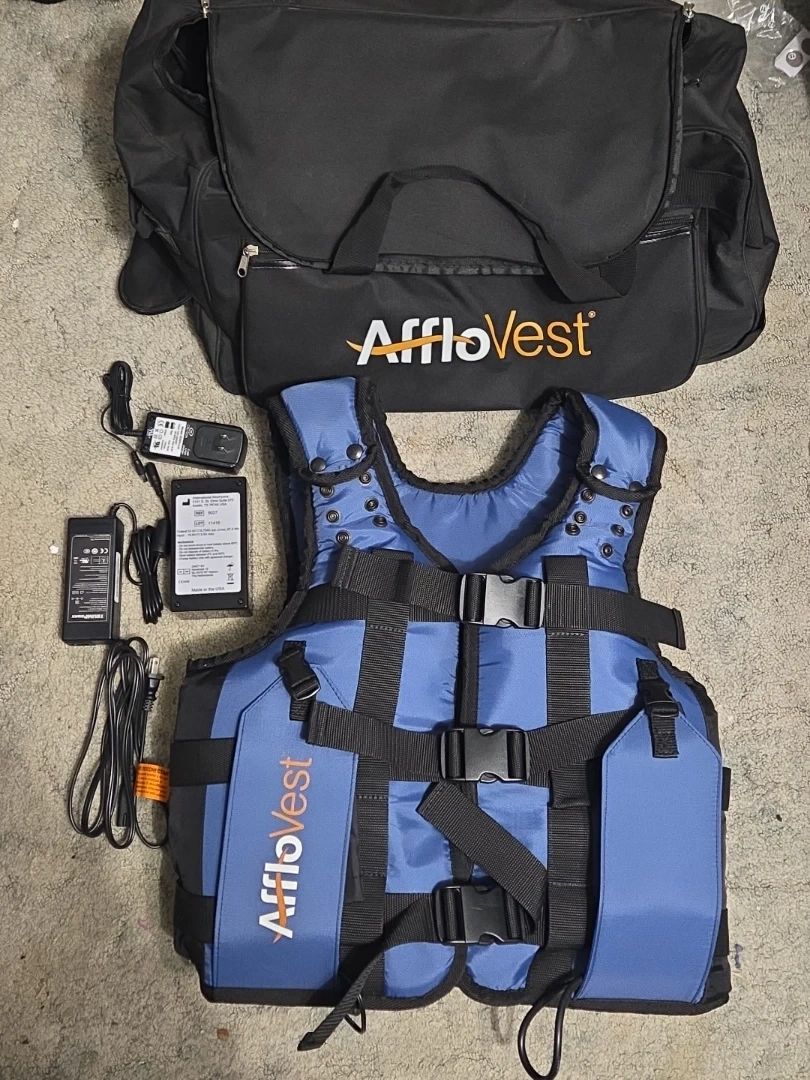AffloVest airway clearance system. It's a vest designed to help clear airways. Includes the vest, carrying bag, two power adapters, and a battery.