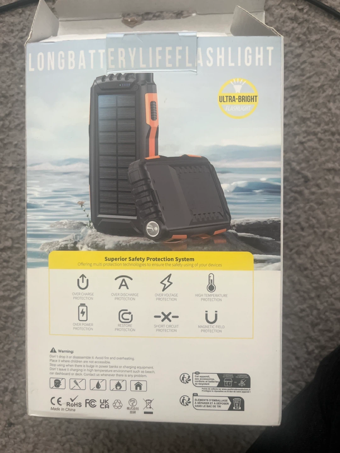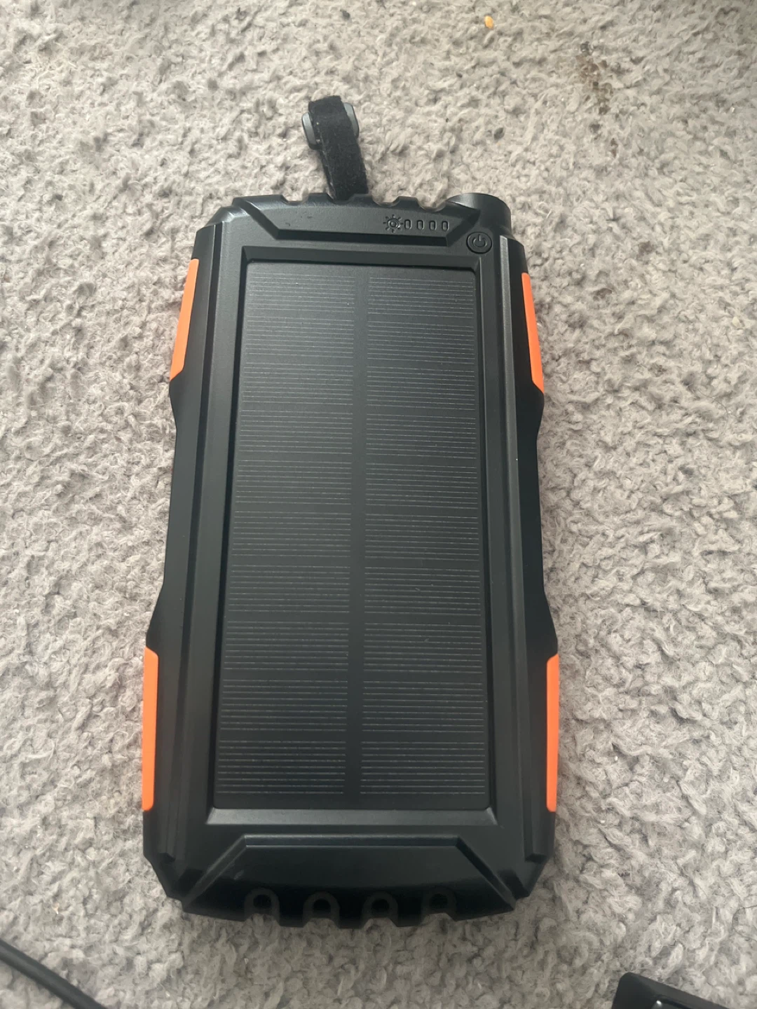 Selling a solar power bank charger! It's black with orange accents and has a solar panel for charging. Great for outdoor activities or emergencies