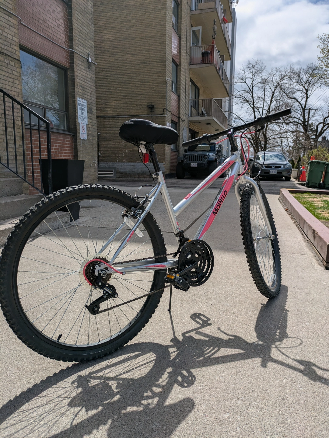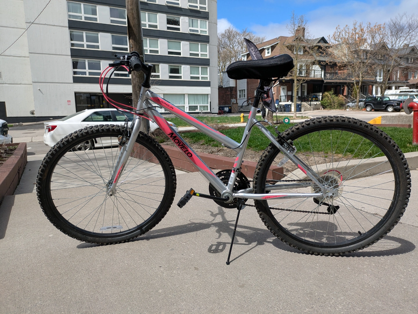 Currently selling two like new Movelo women's mountain bikes. 16 inch frame 26 wheels. Silver with pink streaks, the Movelo Algonquin 26-inch Women's Steel Mountain Bike is ready for outdoor fun! Durable and strong to handle aggressive riding, the Movelo Algonquin is the right mountain bike for whatever path you choose