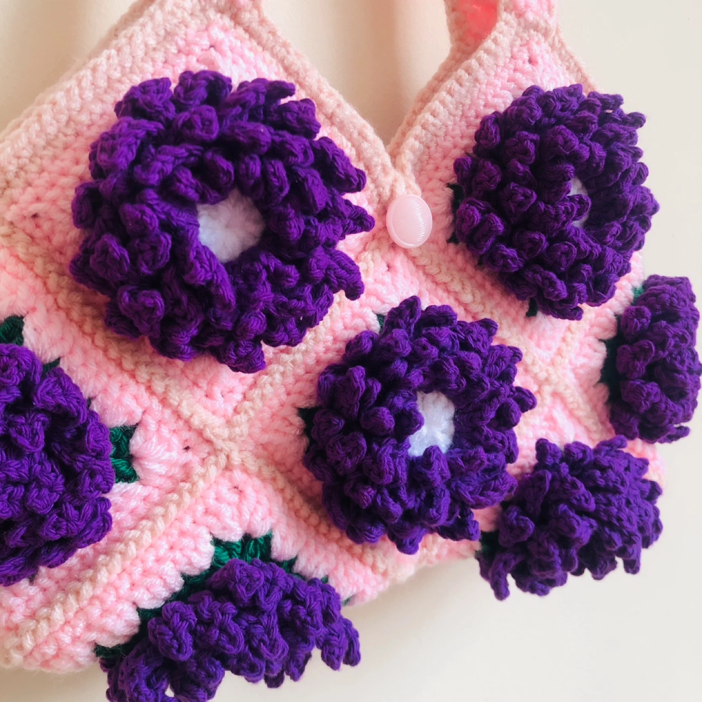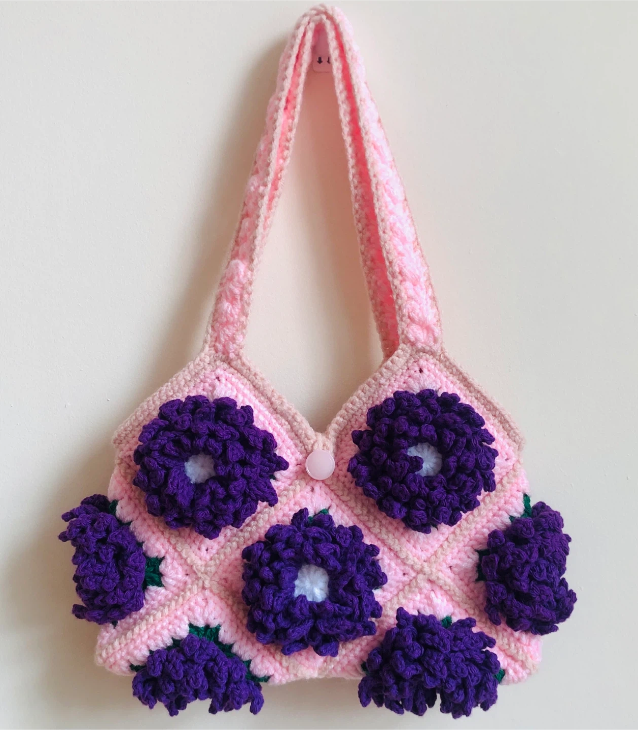 Handmade crocheted handbag with pink base and purple Dahlia flower Features a floral fabric lining.