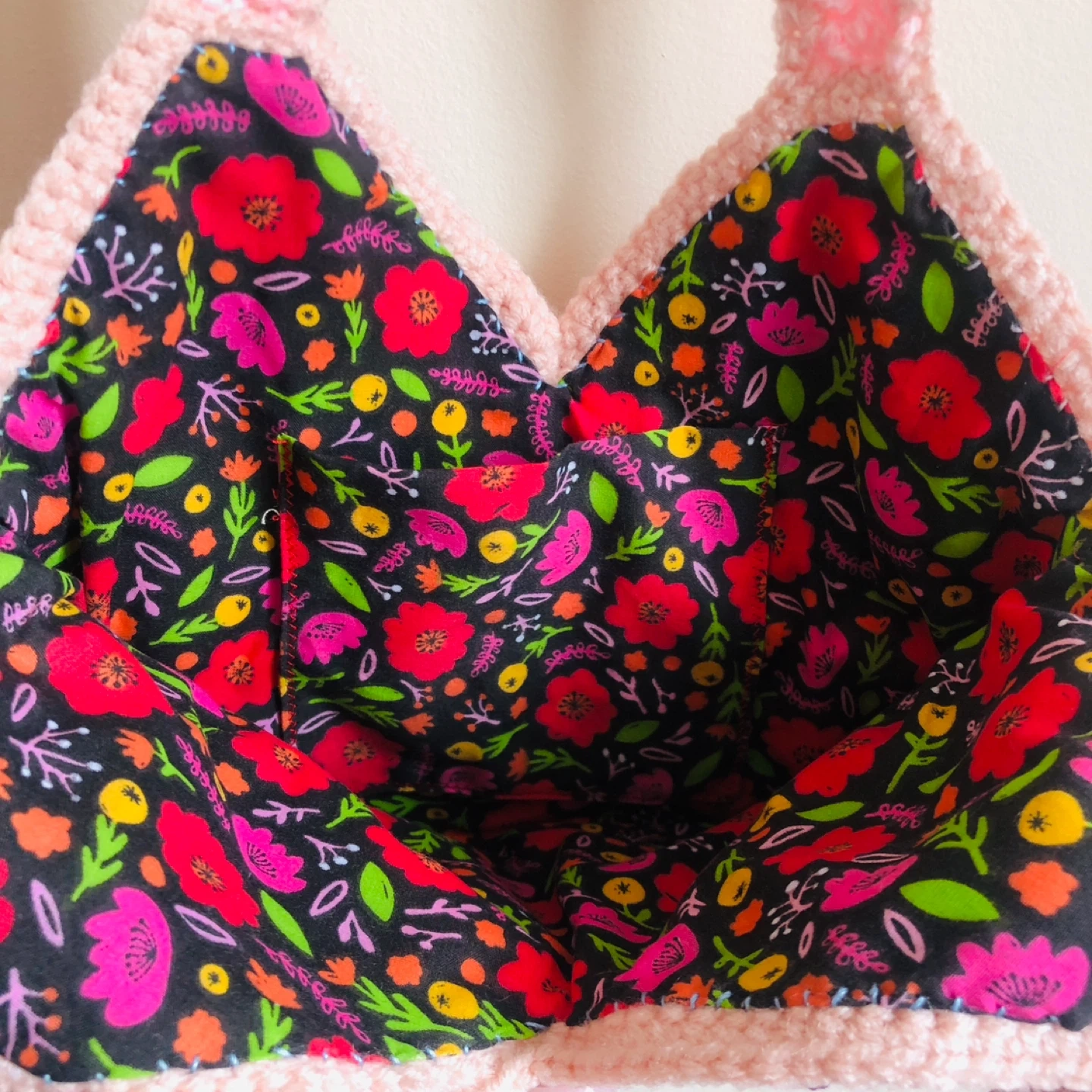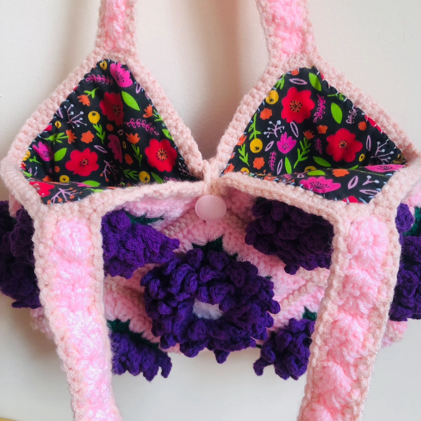 Handmade crocheted handbag with pink base and purple Dahlia flower Features a floral fabric lining.