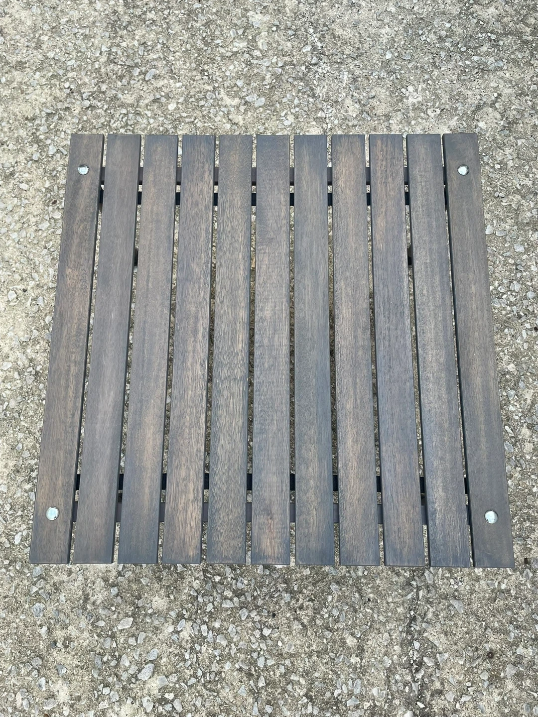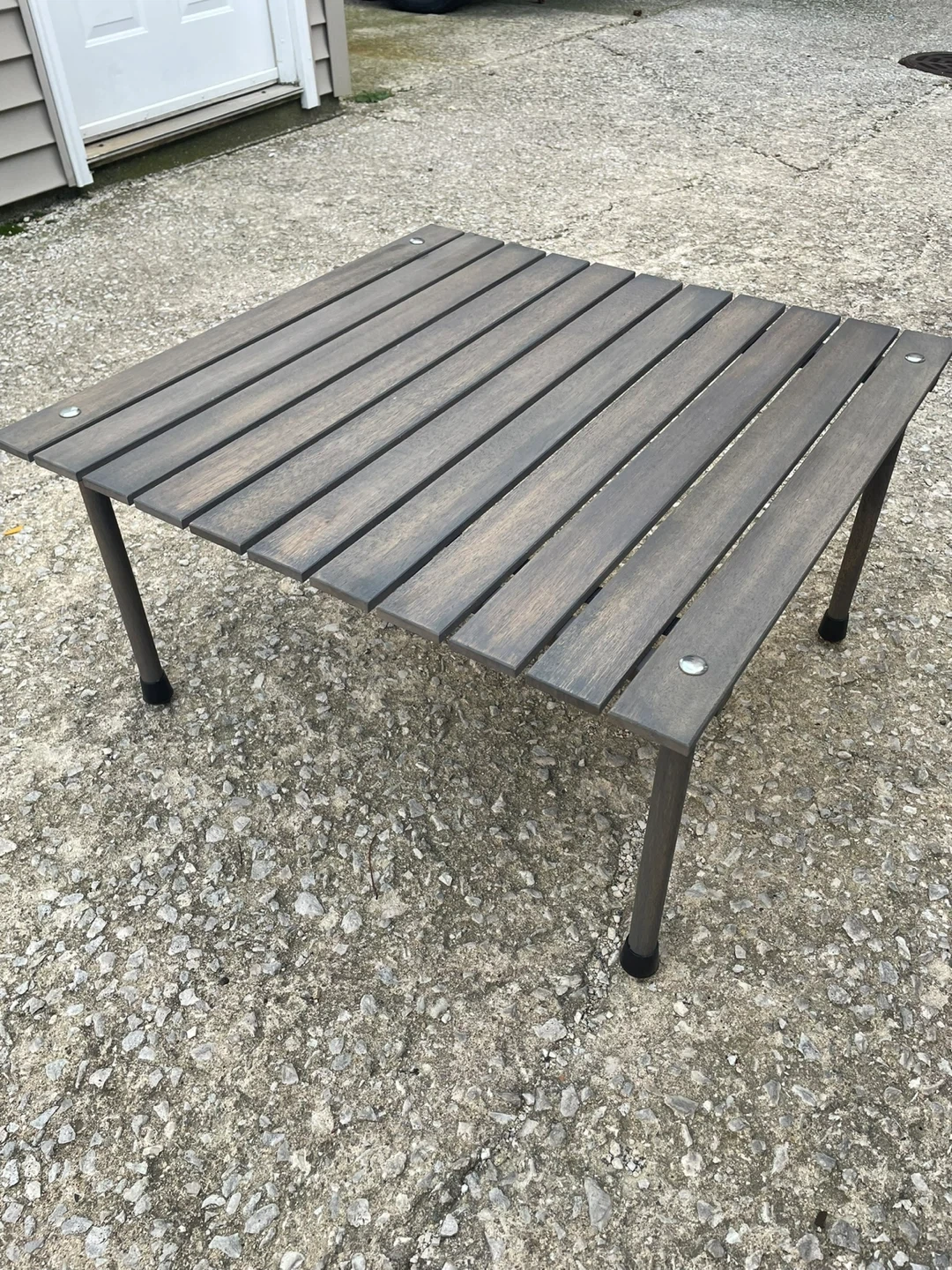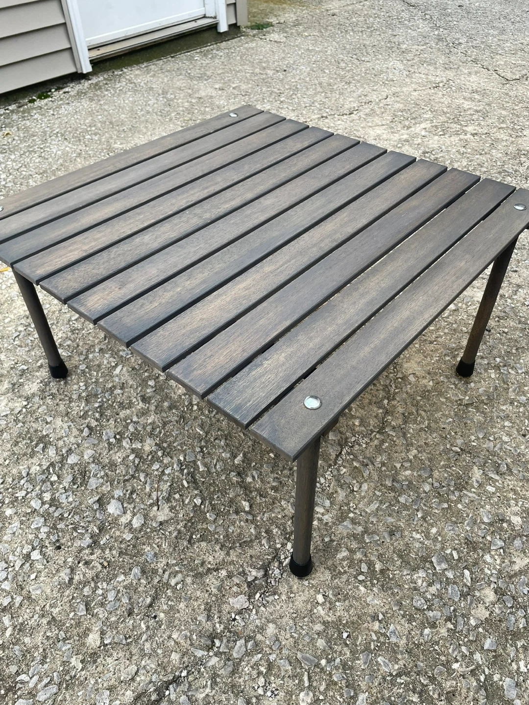 Portable outdoor table from Crate & Barrel. Tabletop and legs are made of wood-look slats with a metal frame. It's easy to assemble and disassemble, perfect for camping or backyard use!