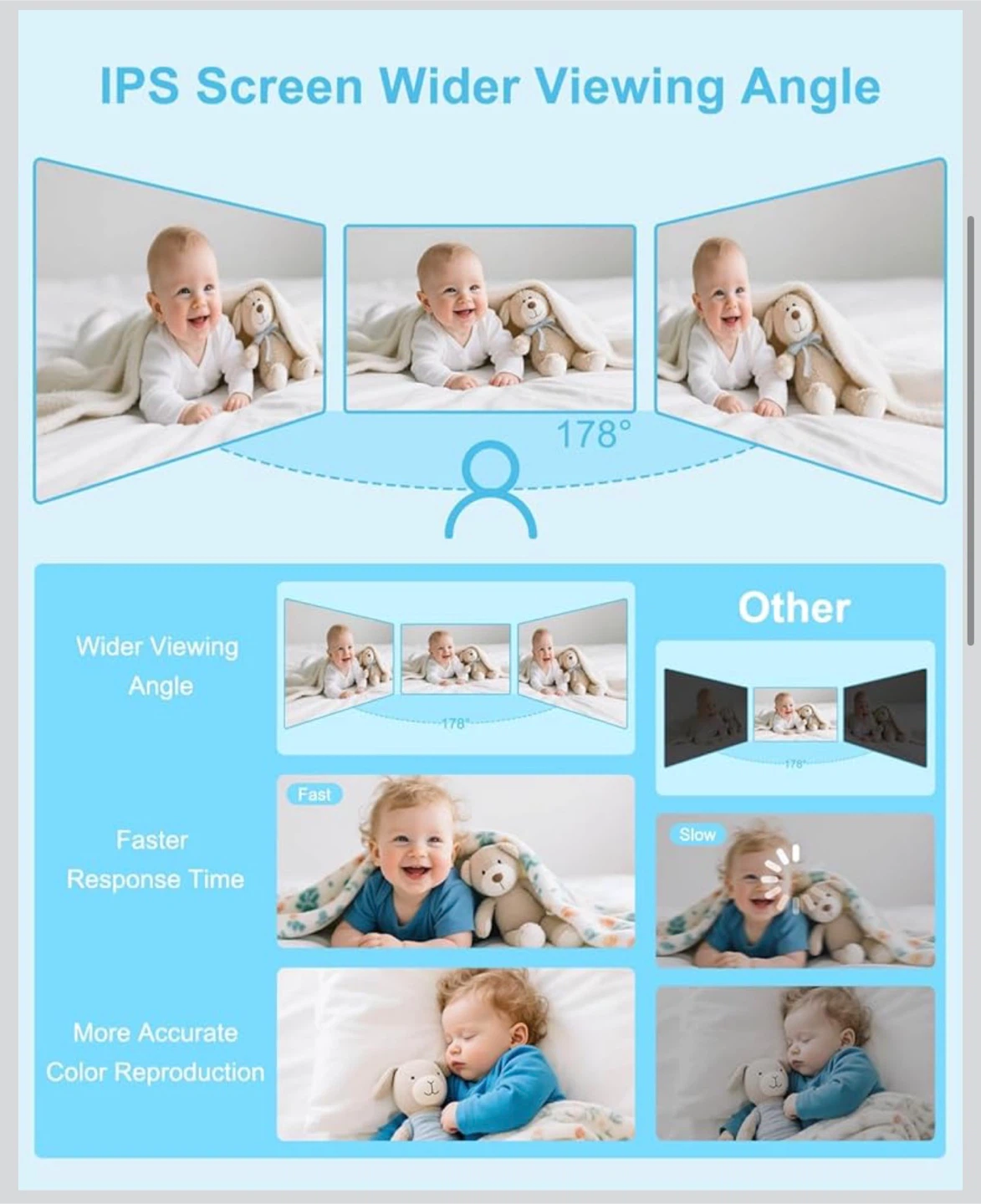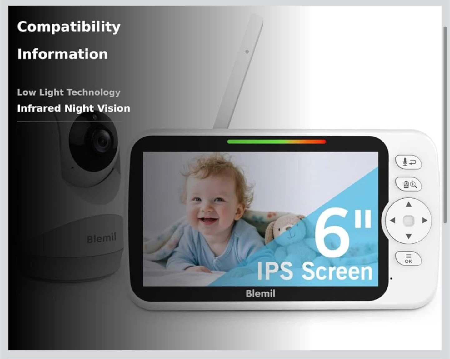 Selling a Blemil baby monitor with a 6" screen! It has a two-way talk feature, remote pan/tilt, infrared night vision, and an ECO mode. It also includes 8 lullabies, 2X zoom in, a temperature alarm, and a range of up to 1000ft. The monitor has a long-lasting battery of 4000mAh, offering 18 hours in screen-on mode and 35 hours in ECO mode