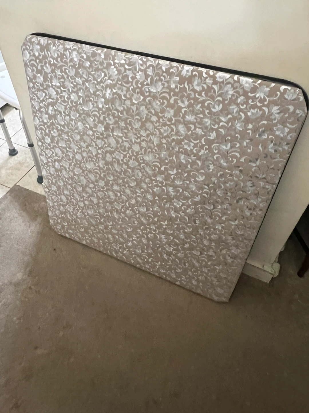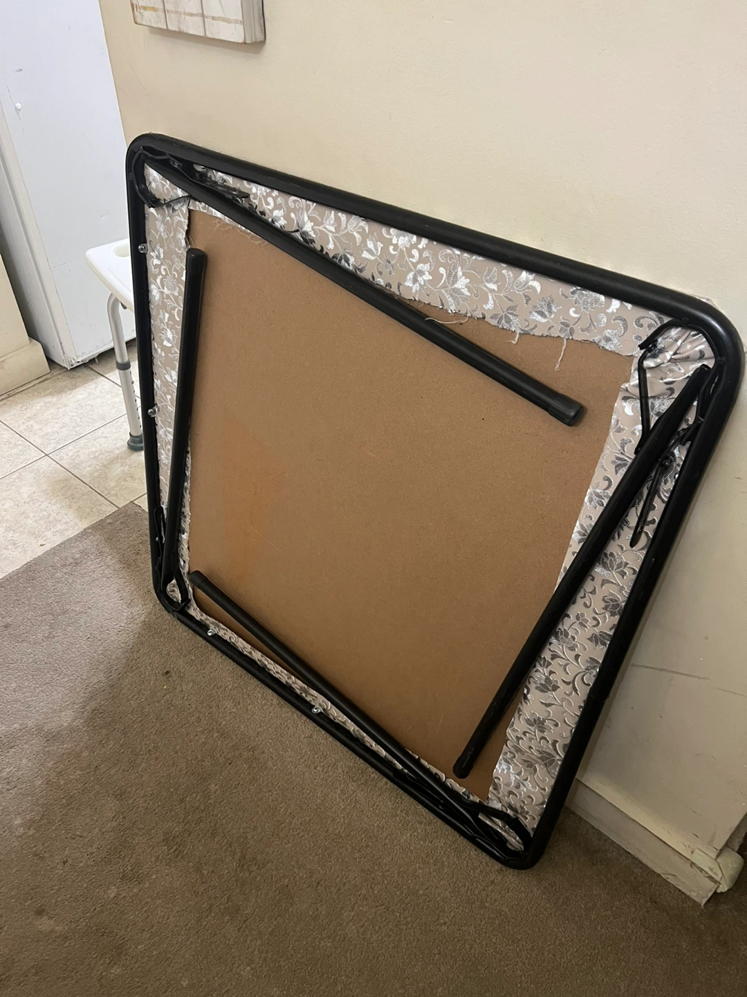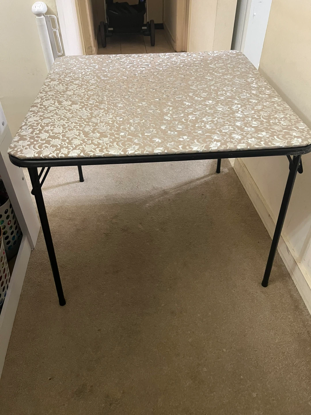 Selling a folding table with a floral pattern top. It's in good condition and perfect for extra space when you need it! The legs fold easily for storage