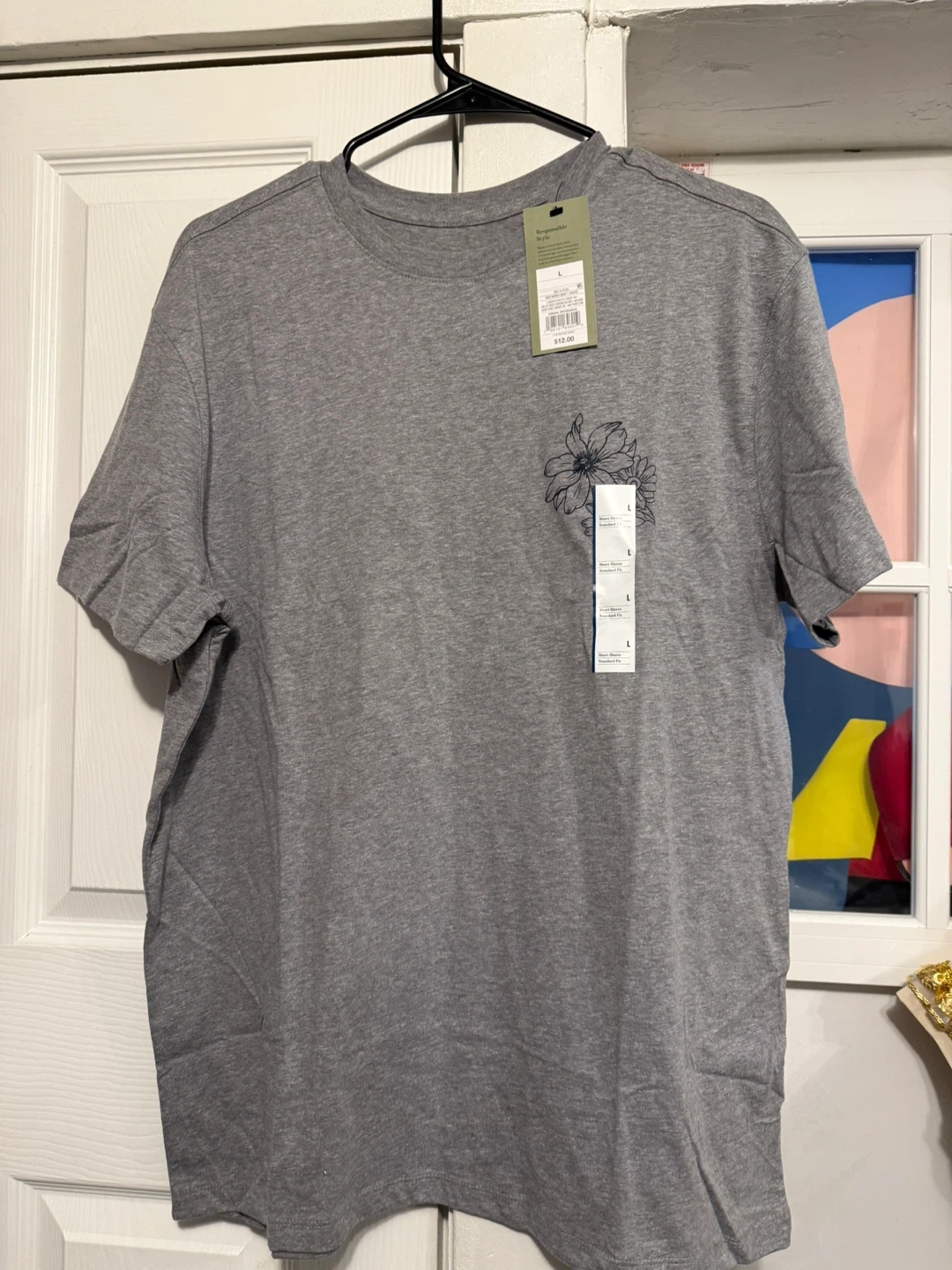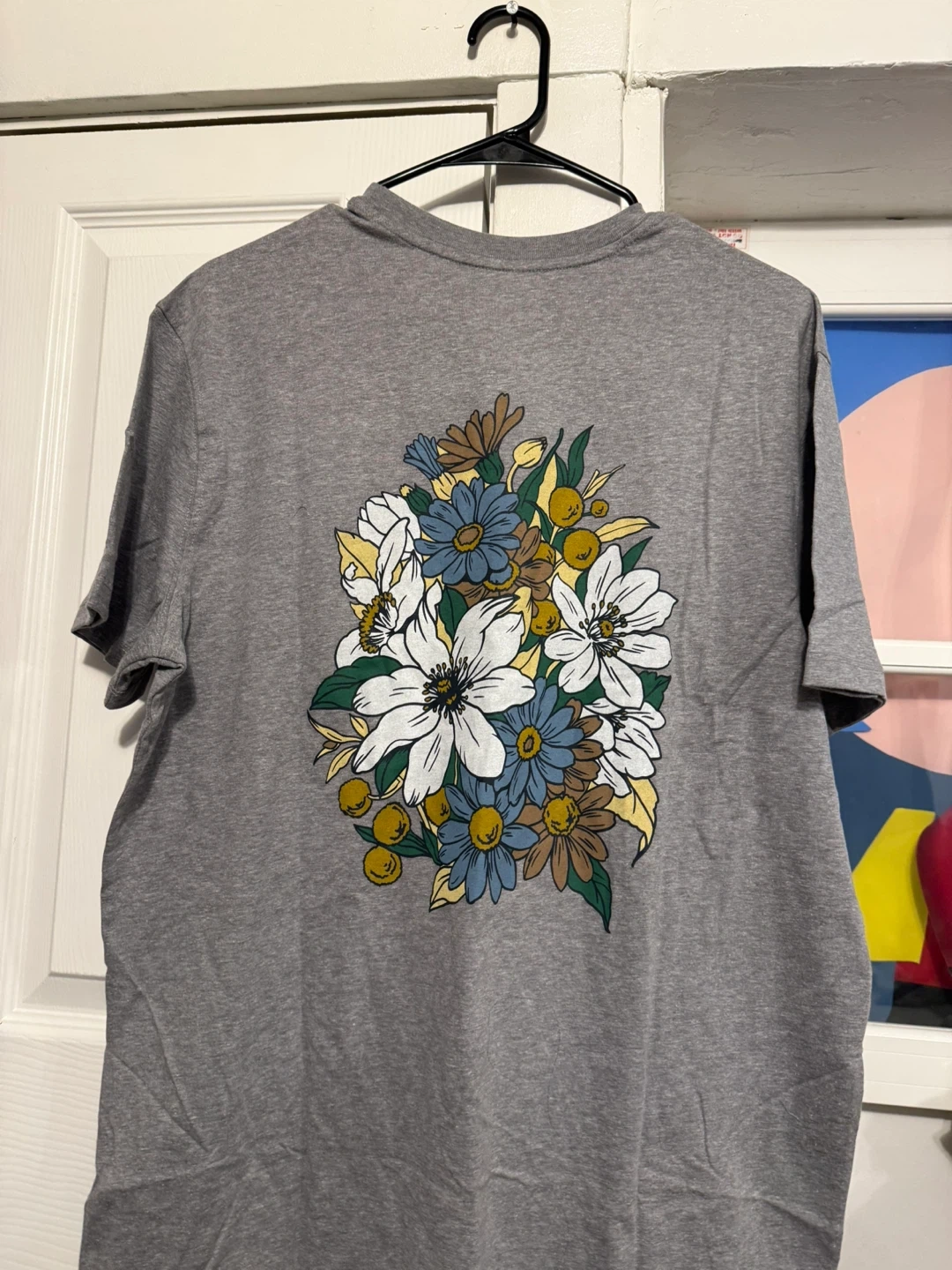 This is a gray, short-sleeve t-shirt from Goodfellow & Co. It features a colorful floral graphic on the back and a small floral design on the left chest. It's a size large. This tee is great for casual wear!