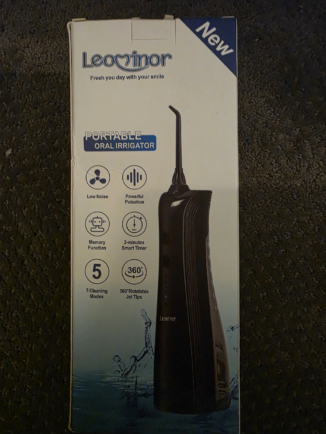 I have a brand new Leominor portable oral irrigator still in its box! It features low noise, powerful pulsation, a memory function, and a 2-minute smart timer. It also has 5 cleaning modes and 360° rotatable jet tips