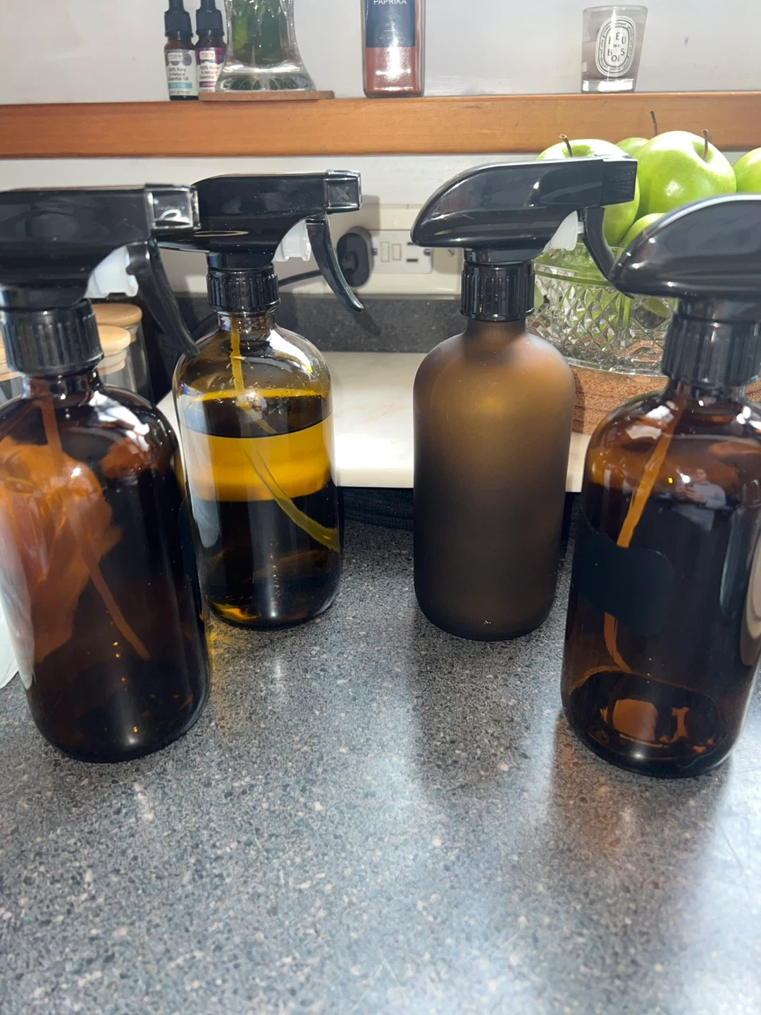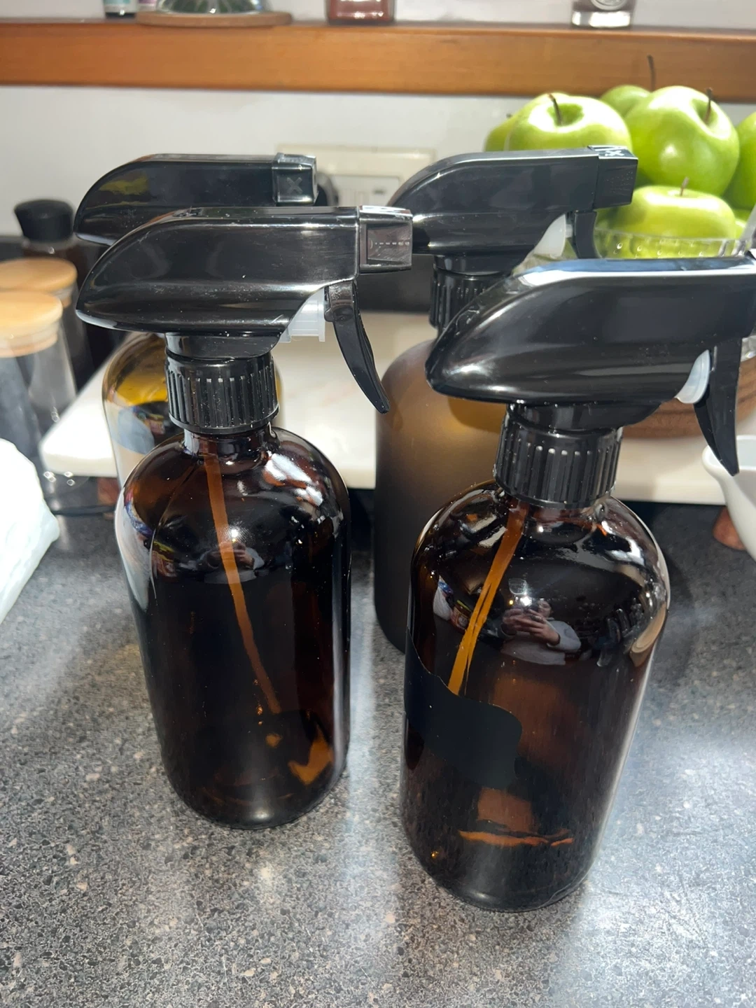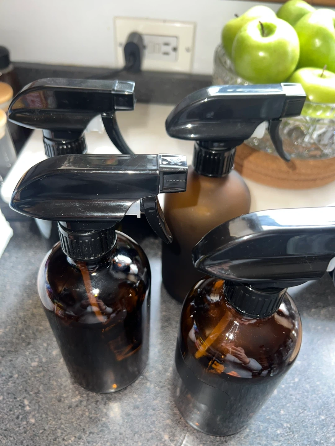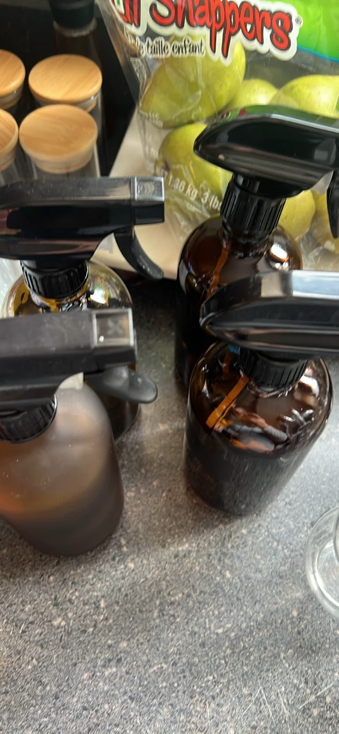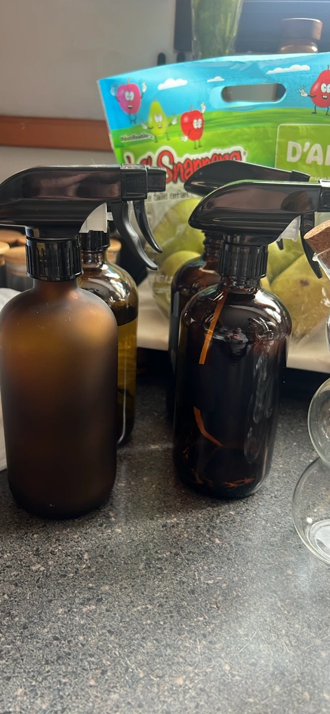 Set of four amber glass spray bottles. These bottles are great for homemade cleaning solutions, essential oil blends, or hairsprays. Amber glass helps protect contents from UV light. Each bottle's capacity is approximately 16oz. Includes spray triggers with adjustable nozzles.