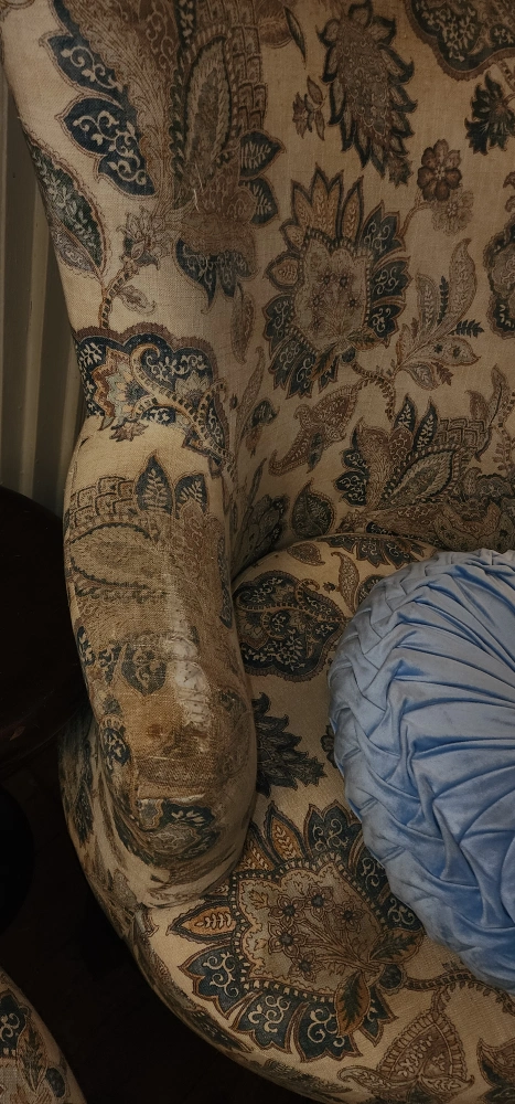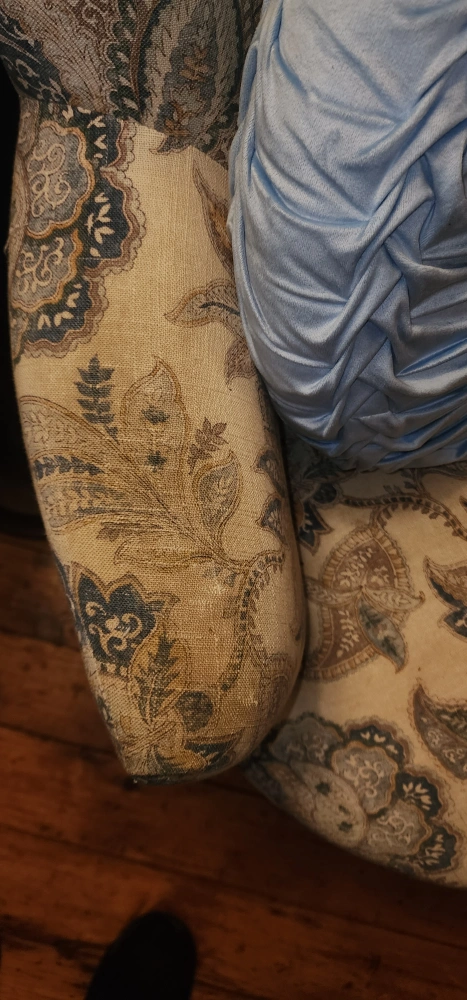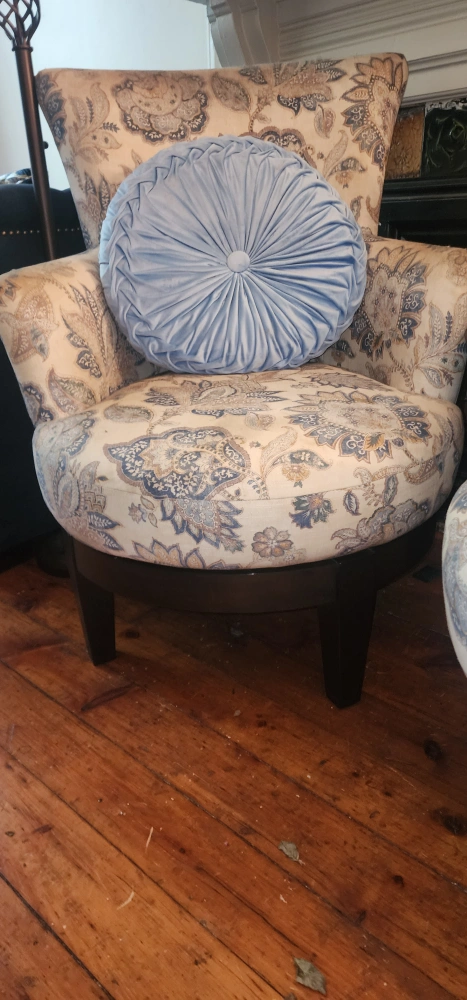 Elegant swivel chair with floral patterned upholstery. Features a matching circular throw pillow. You can easily unwind in this comfy chair after a long day. Very "shabby chic" reminds you of grandma 👵 ❤️