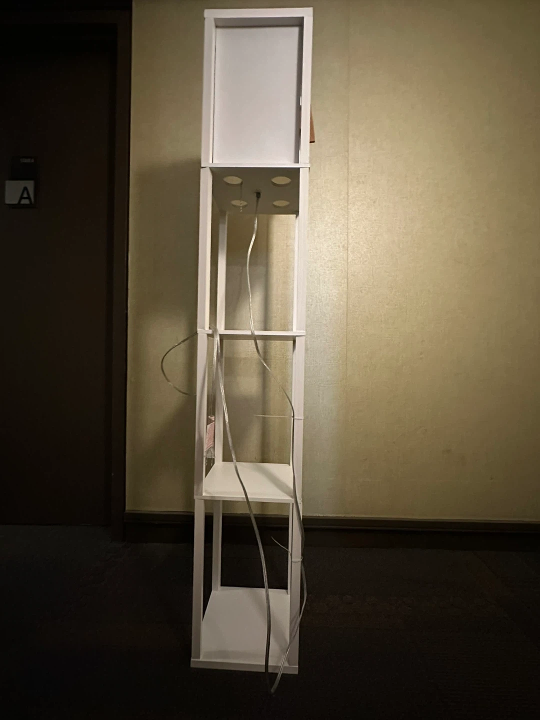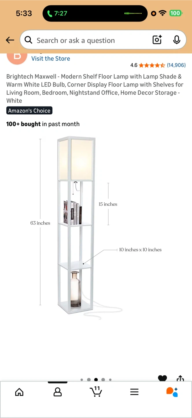 This Brightech Maxwell floor lamp offers a modern design with integrated shelves. It stands 63 inches tall and includes shelves measuring 10 x 10 inches. Not include bulb.
