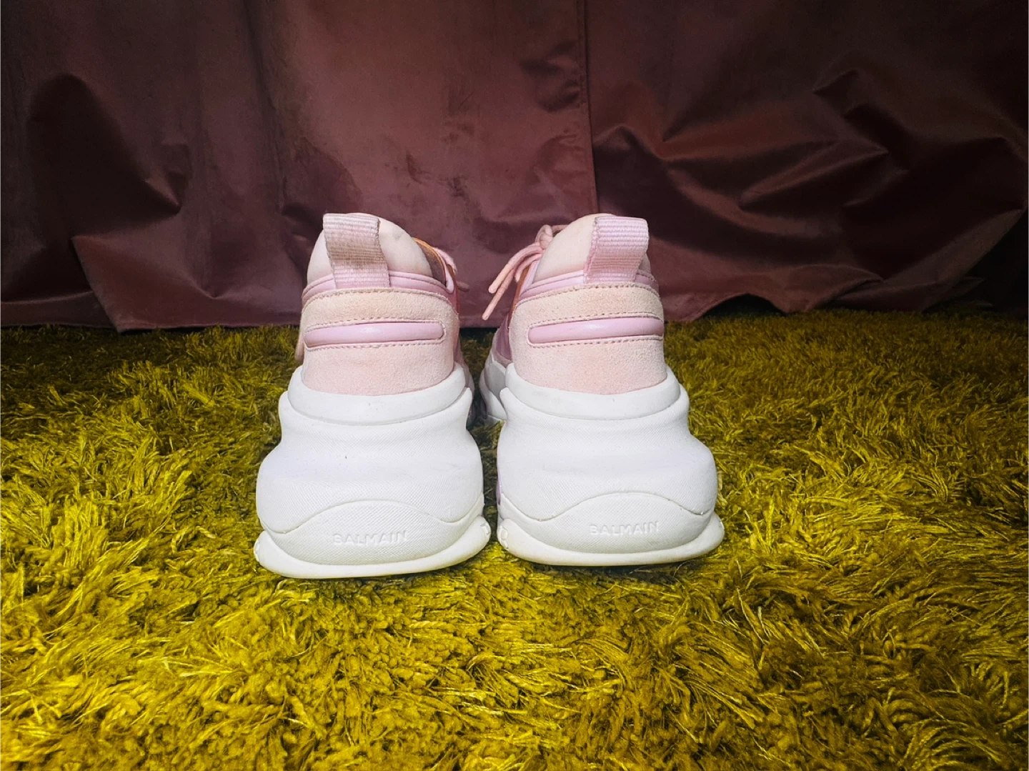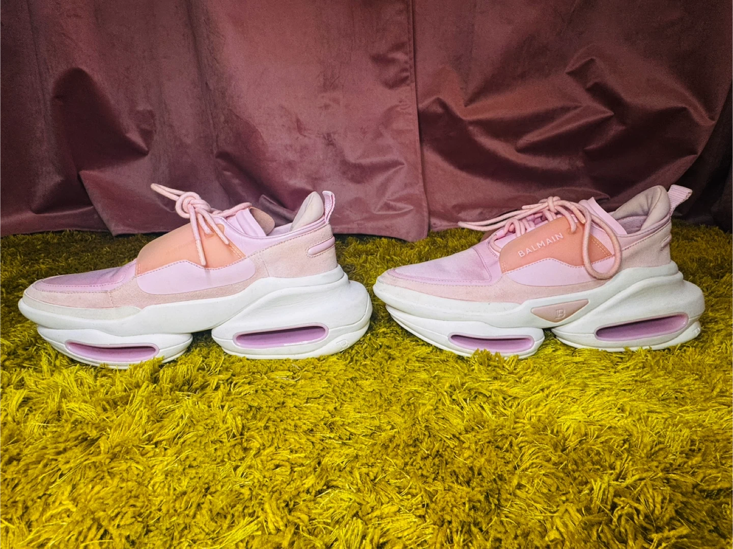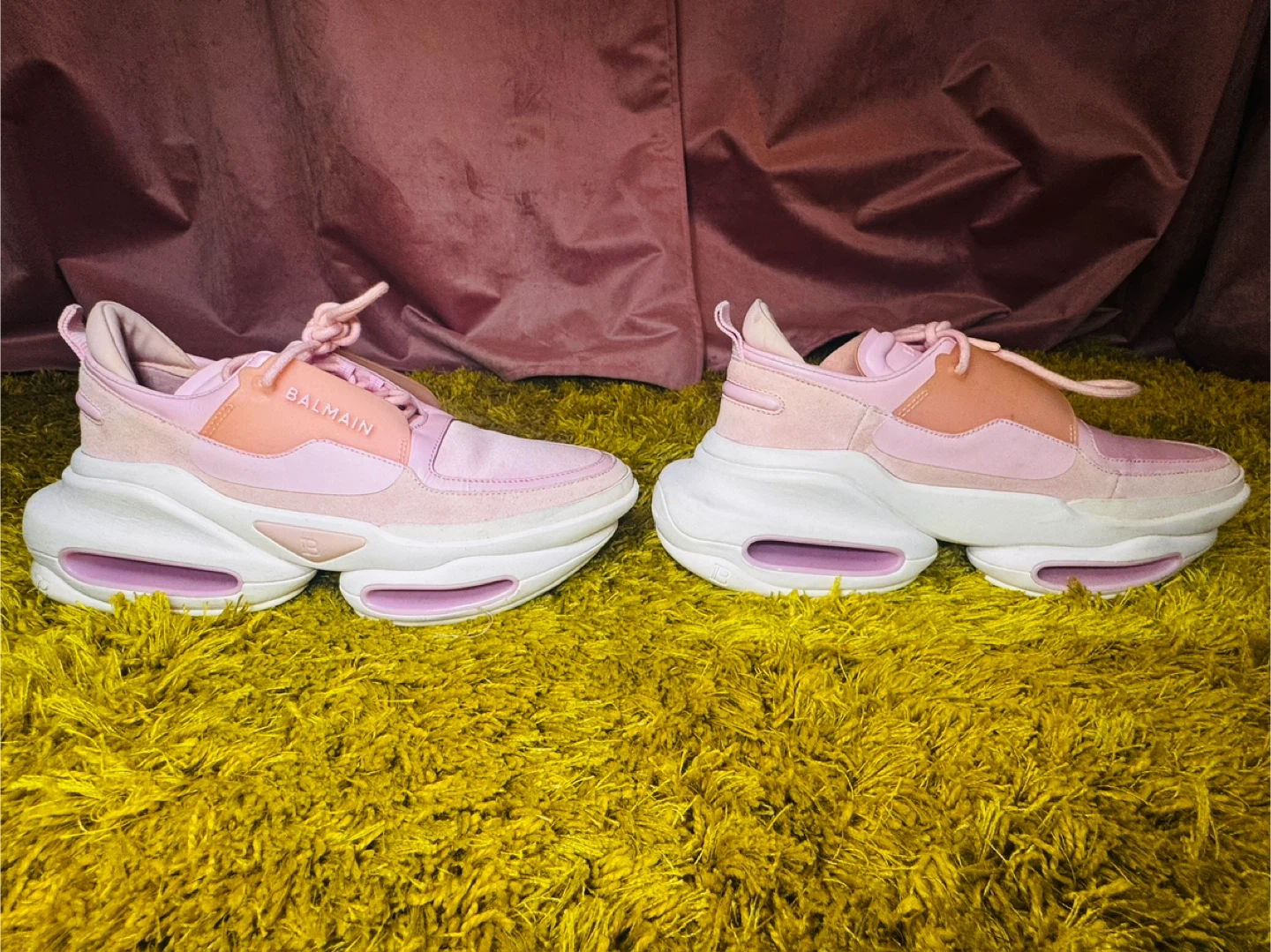 Balmain Bold pink sneakers with a chunky white sole. These stylish sneakers feature a mix of suede and smooth fabric uppers. They're perfect for adding a pop of color to any casual outfit!
