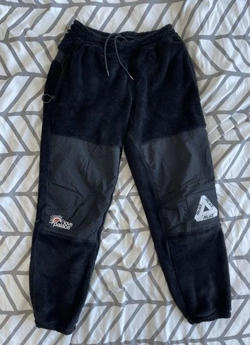The Palace Fleece Pants in black size medium are a stylish and authentic addition to any man's wardrobe. Made from 100% authentic fleece material, these sweatpants feature a comfortable regular fit and are designed by the popular brand Palace. The sleek black color and cozy fleece fabric make these pants versatile and perfect for casual wear.