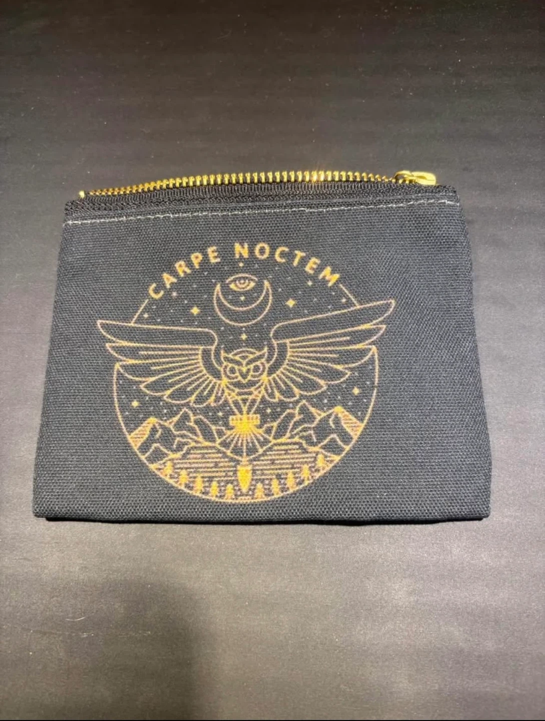 I'm selling a black coin purse with the words 'Carpe Noctem' and an owl design on the front.