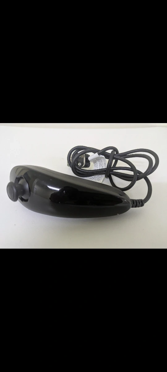 Black Nintendo Wii Nunchuk controller with an attached cord. It connects to the Wii Remote for enhanced gameplay. Cable is approximately 3 feet long.