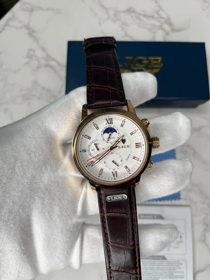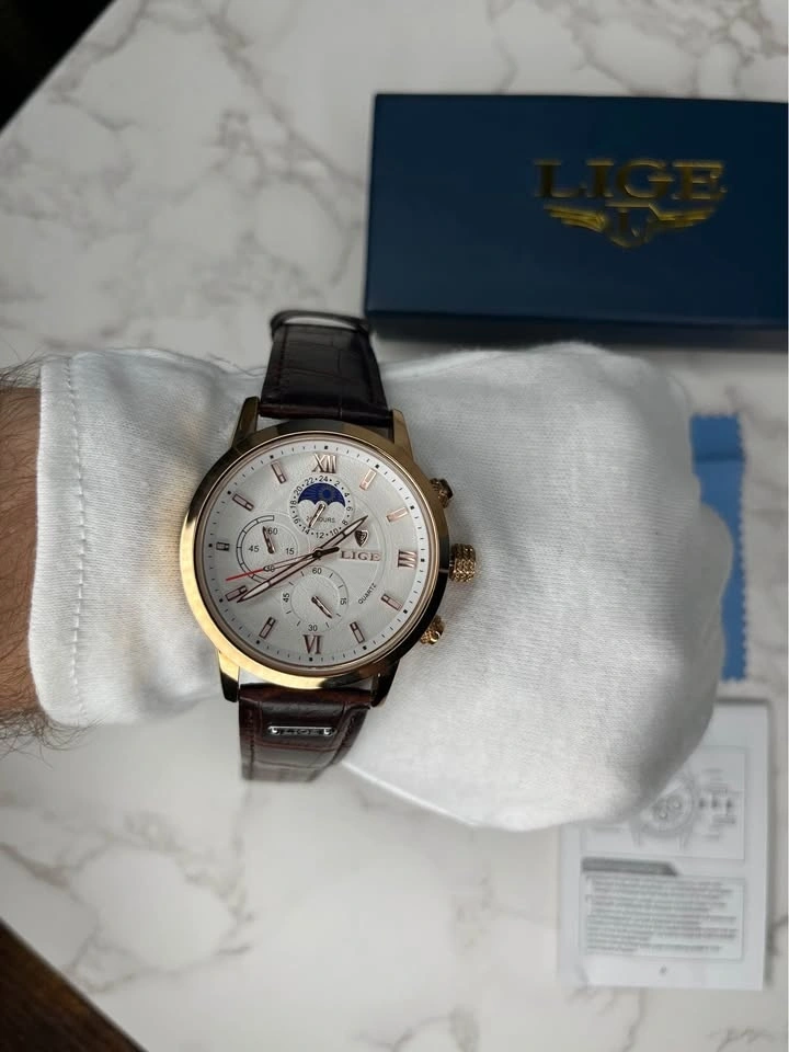 Men’s Watch LIGE In Gold Color And Brown Band Brand New, comes with original box, cleaning towel and manual.