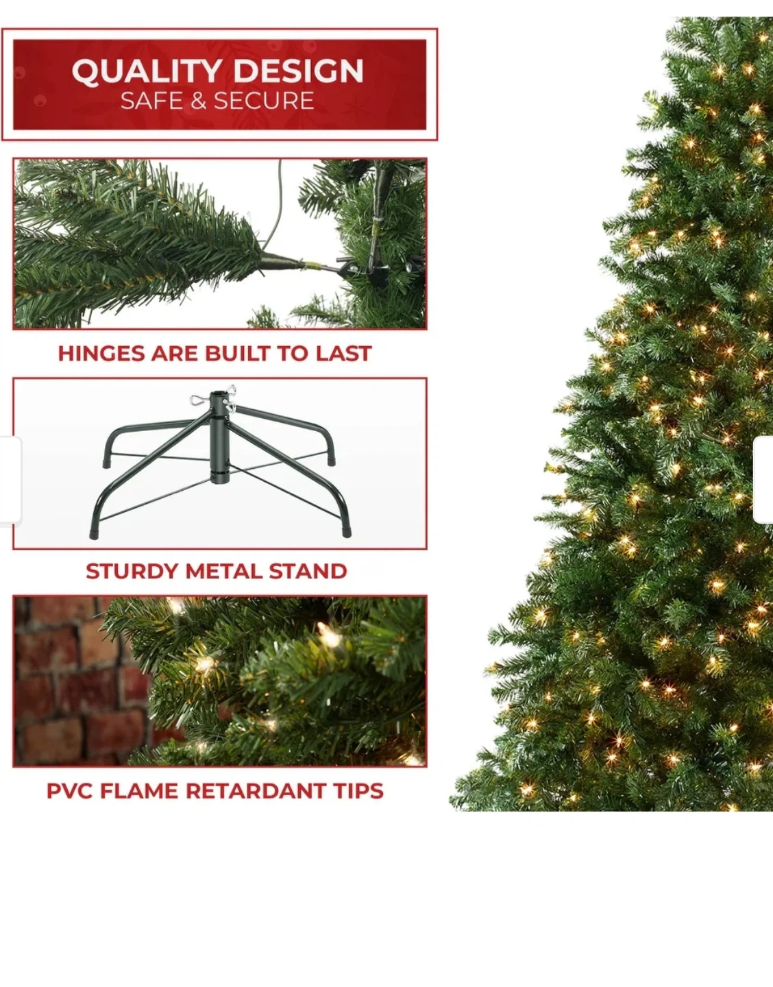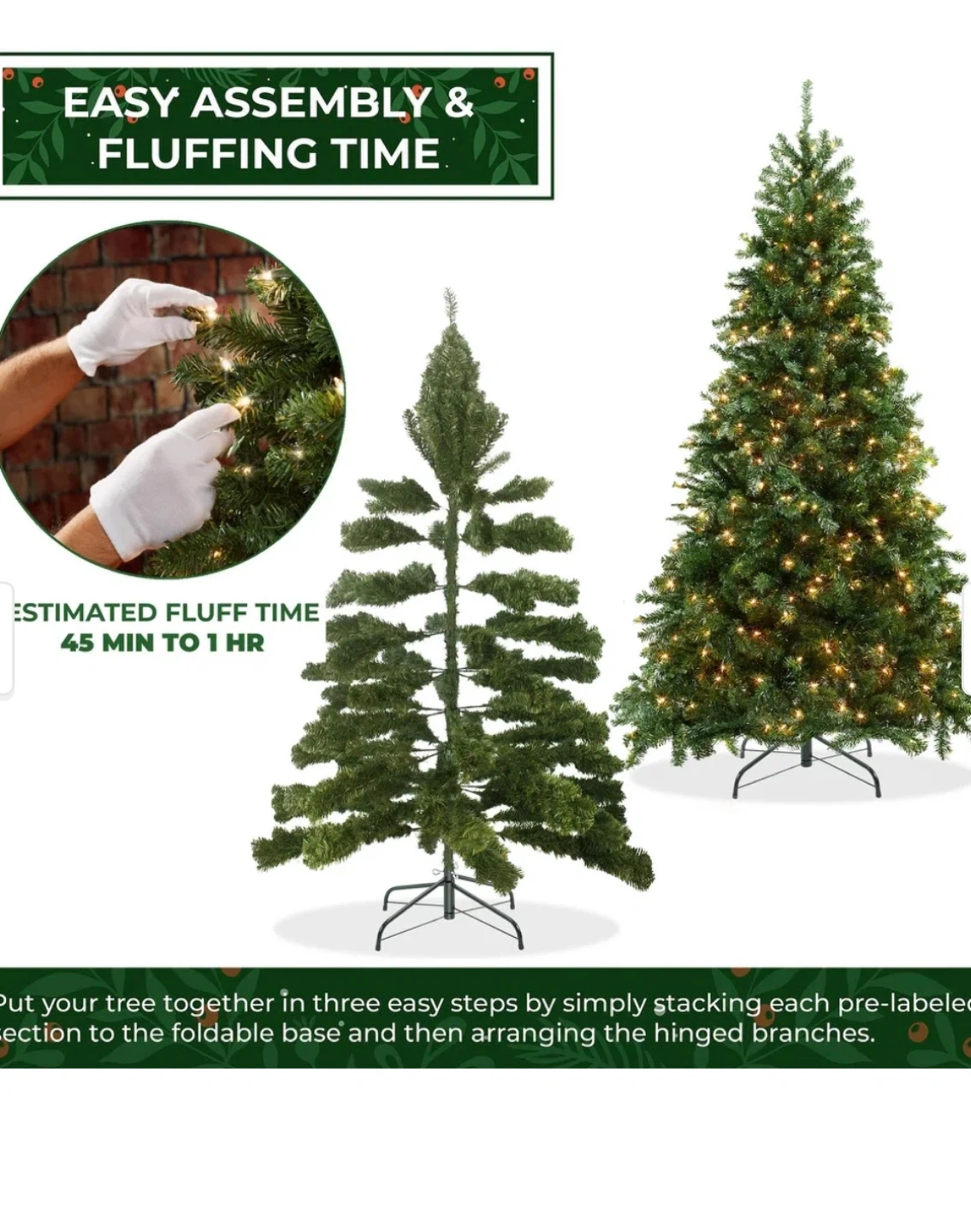 60Get ready for the holidays with this 9ft pre-lit artificial Christmas tree! It features a sturdy metal stand and PVC flame retardant tips for safety. It's designed for easy assembly and fluffing, with an estimated fluff time of 45 minutes to 1 hour. Plus, it's easy to fold and store after the season is over