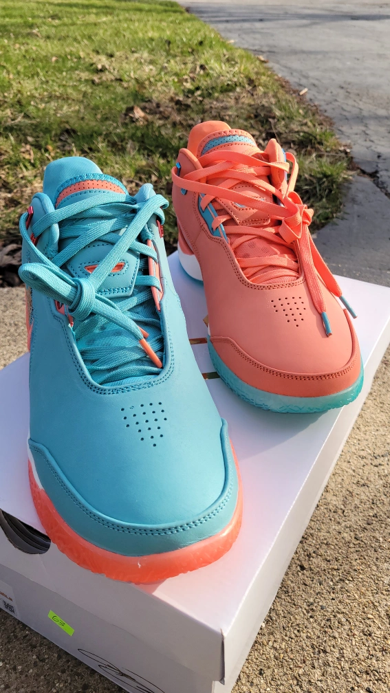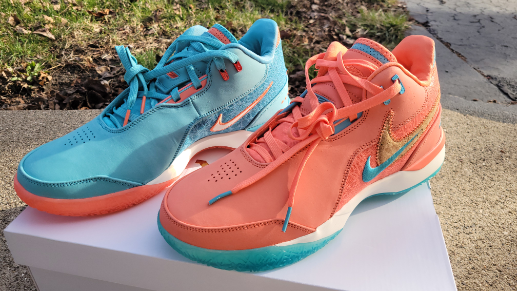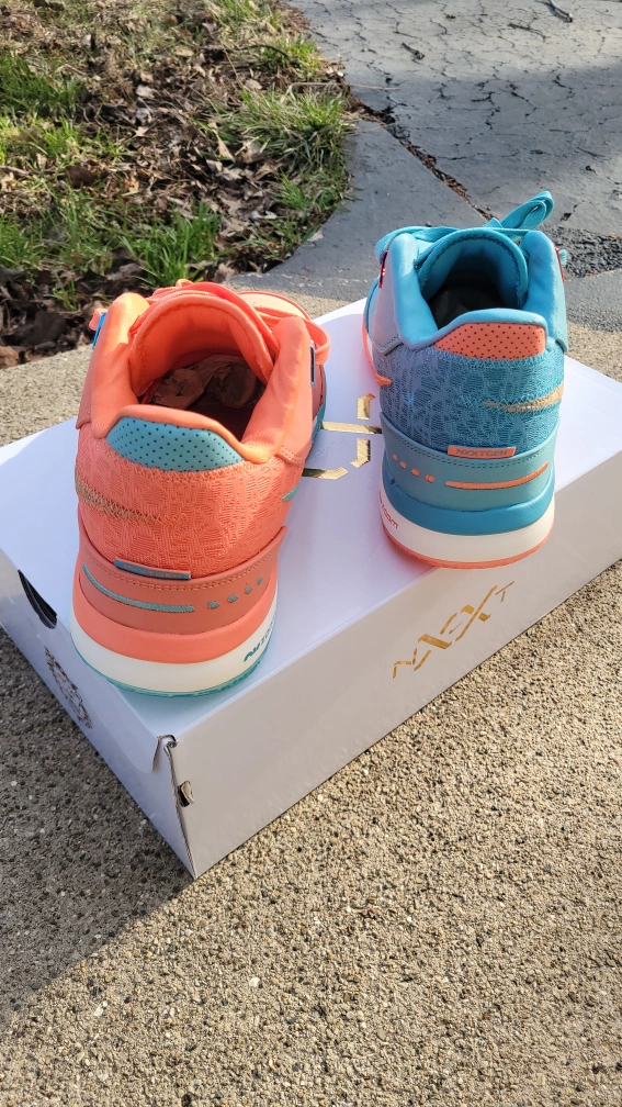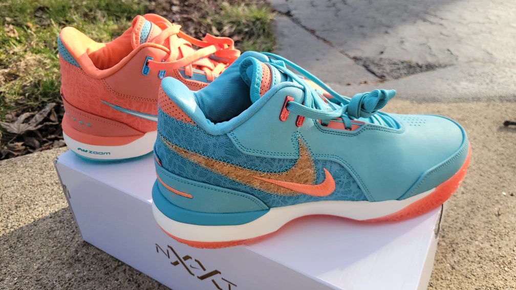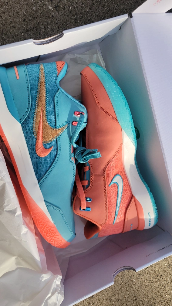 Nike labron james nxxt gen miami basketball shoes in a salmon and turquoise colorway. Features a textile and leather upper with a rubber sole. Includes original box.