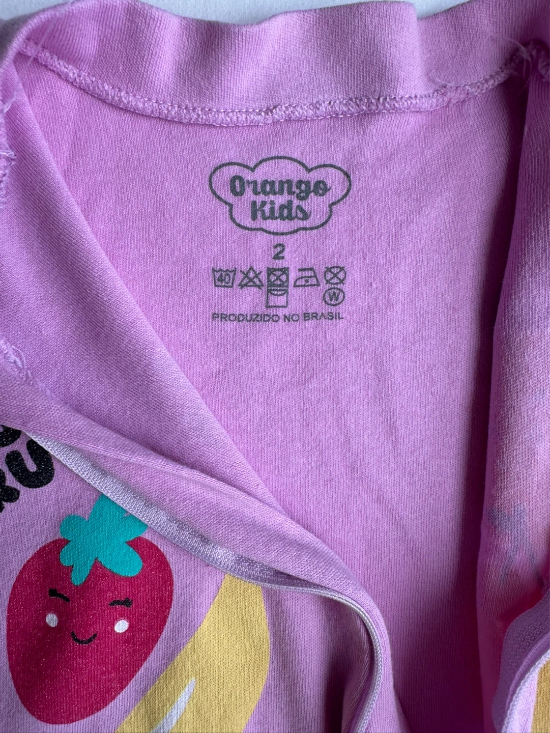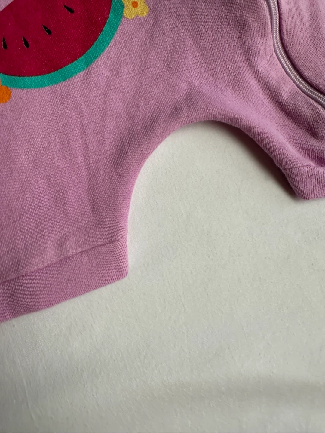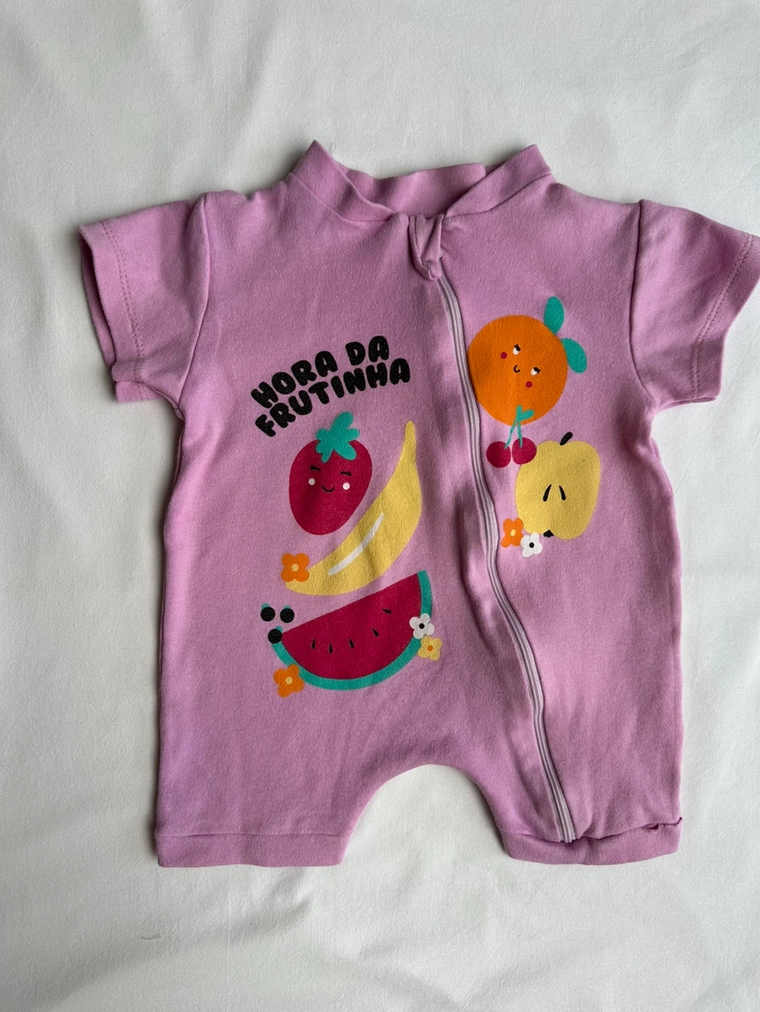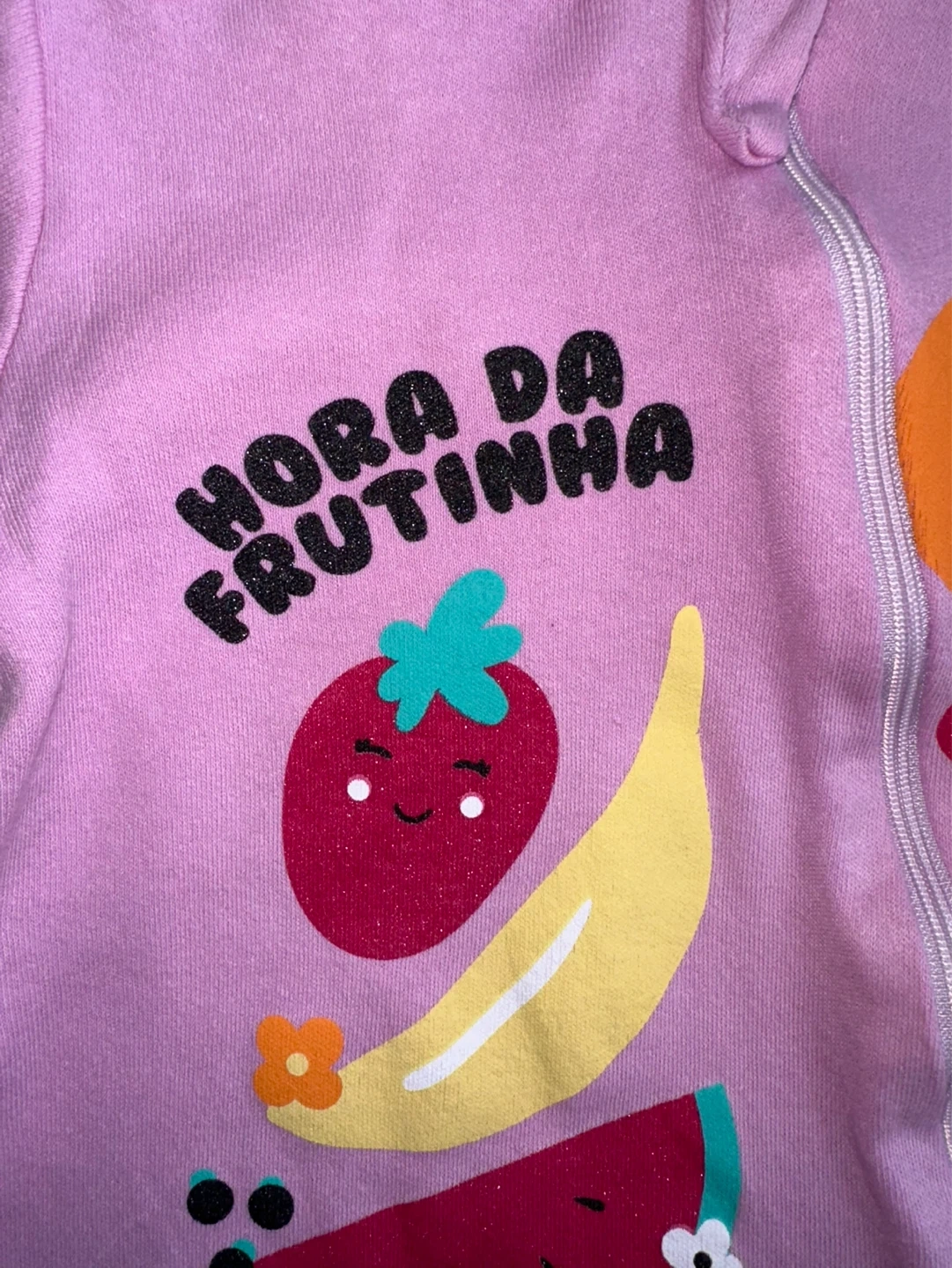 This adorable pink onesie features a cute fruit print with a strawberry, banana, watermelon, orange, and apple. It has a zipper closure for easy dressing. Made of cotton for your little one's comfort.