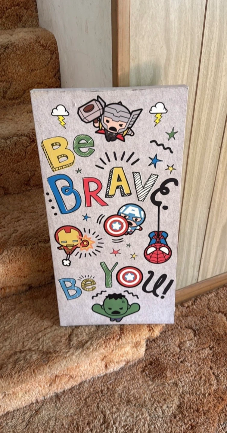 This decorative piece features popular Marvel characters like Thor, Iron Man, Captain America, and Spider-Man. It has the motivational phrase 'Be Brave Be You!' printed on it. Great for a child's room!