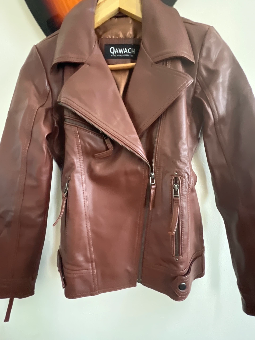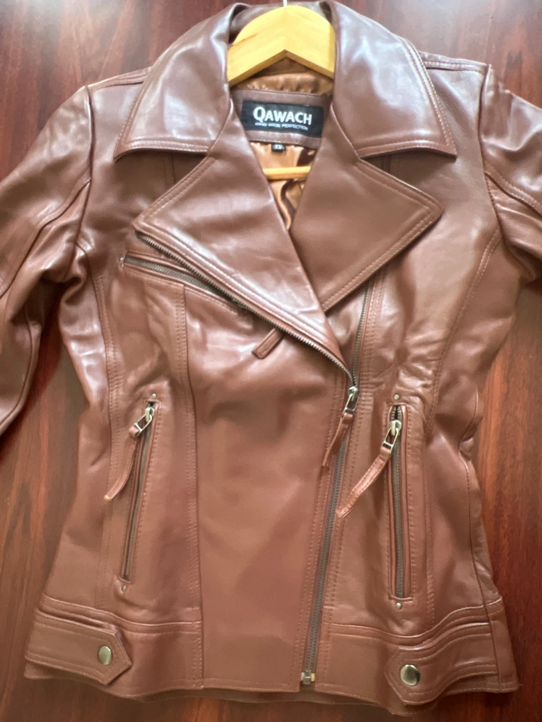 Here's a stylish Qawach brown leather jacket in size XS! It's a beautiful brown color and made of leather. This jacket is perfect for adding a touch of edgy sophistication to any outfit