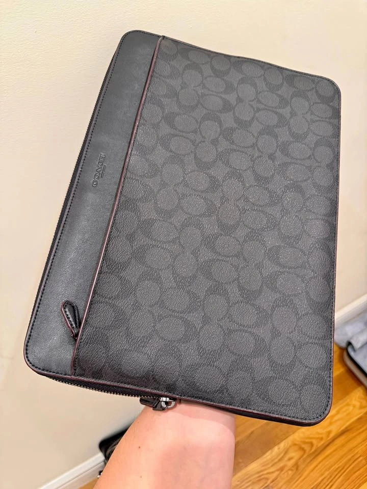 Elevate your work-from-anywhere setup with this sleek Coach laptop portfolio. Crafted in the brand’s iconic charcoal signature coated canvas with smooth leather details, this sleeve offers premium protection without the bulk of a full briefcase. It’s thin enough to slide into your backpack but stylish enough to carry on its own into a meeting.