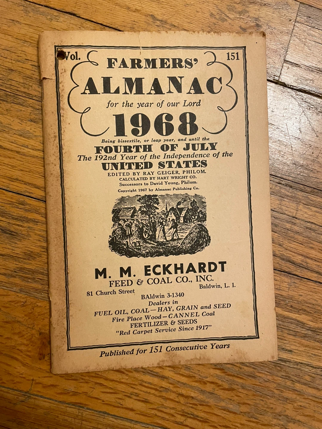 This is the Farmers' Almanac for 1968, the 192nd year of U.S. Independence. It was copyrighted in 1967 by Almanac Publishing Co. It lists M. M. Eckhardt Feed & Coal Co. as dealers for fuel oil, coal, hay, grain, and seed.