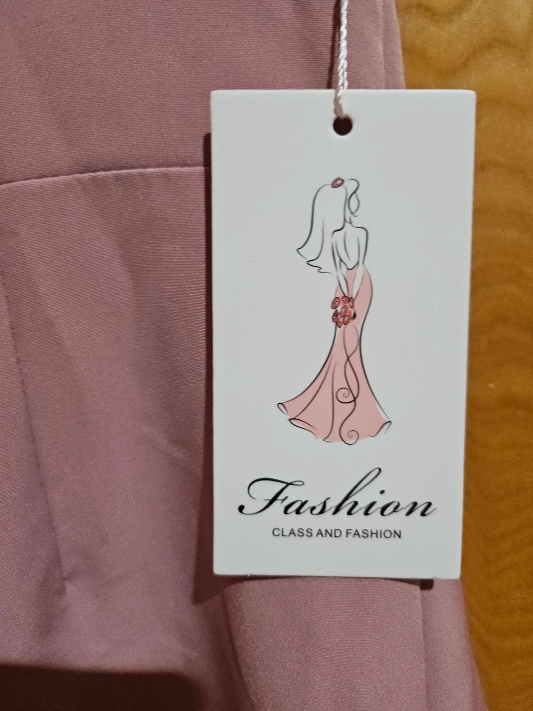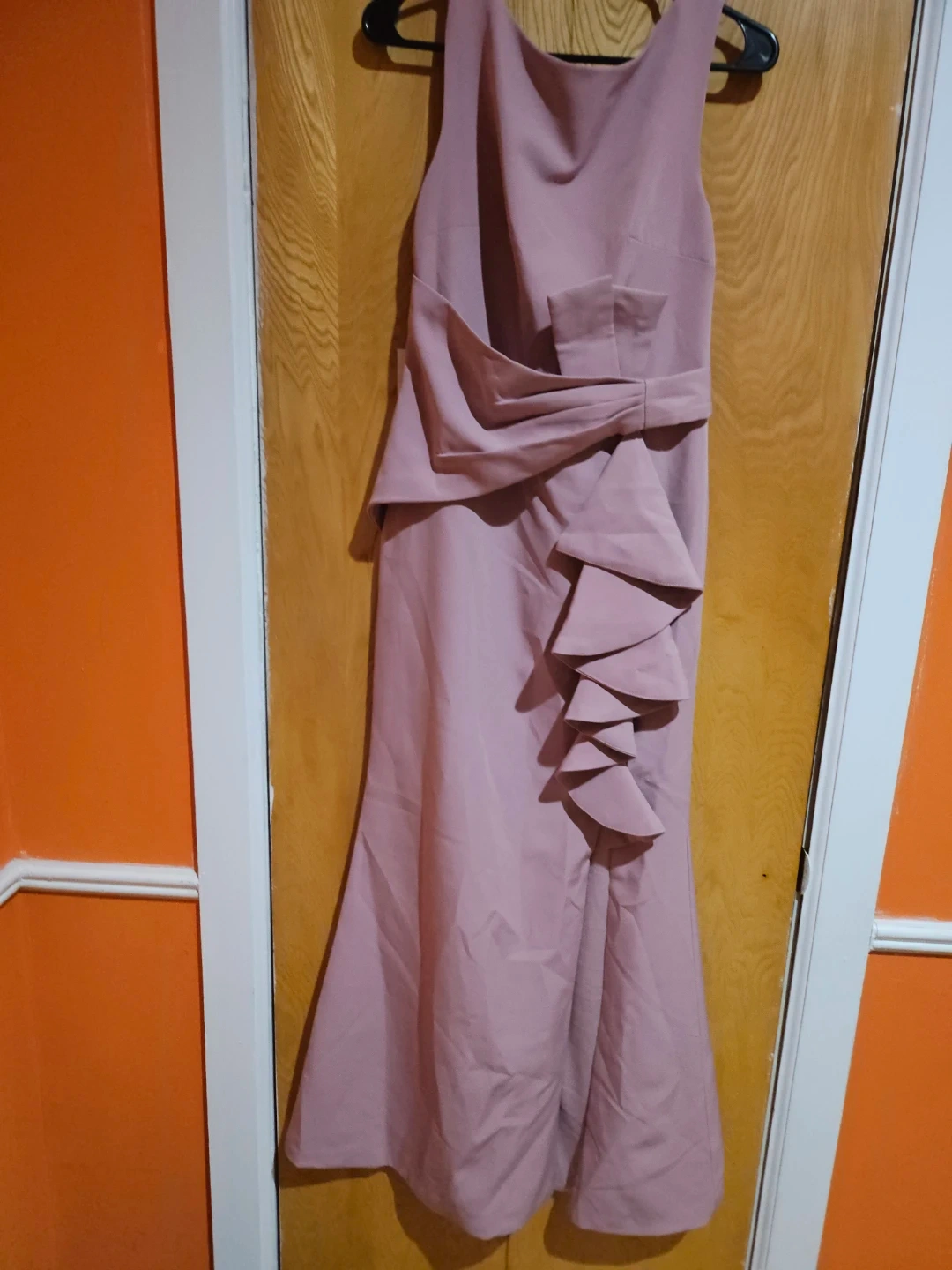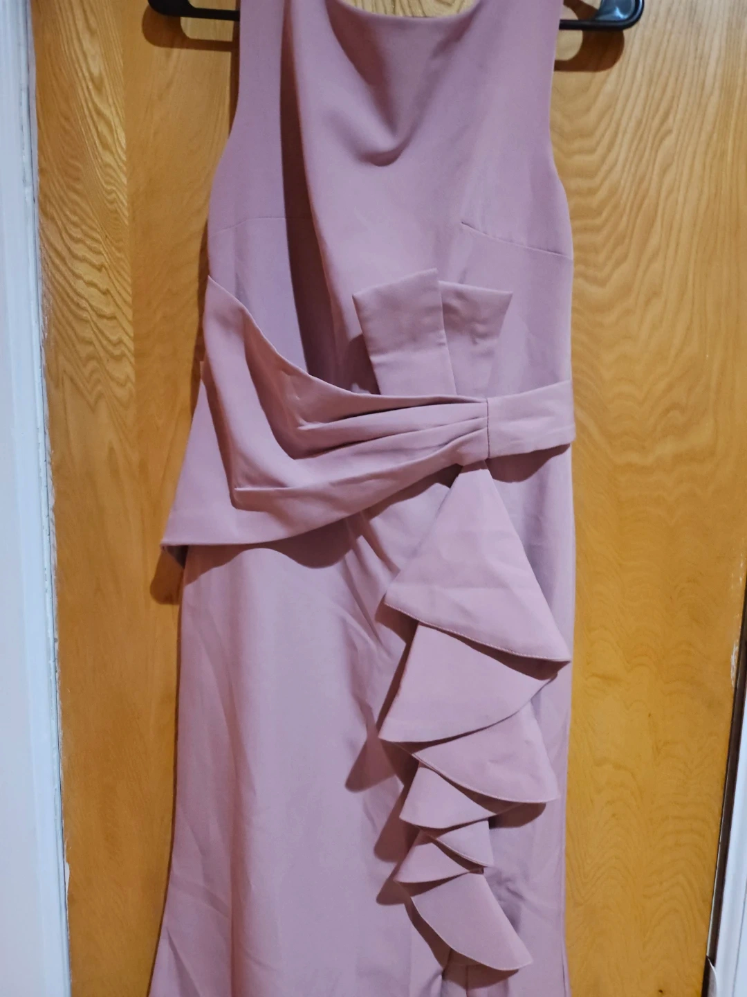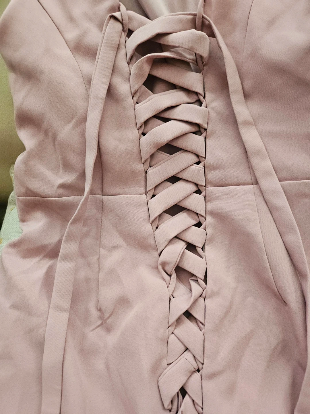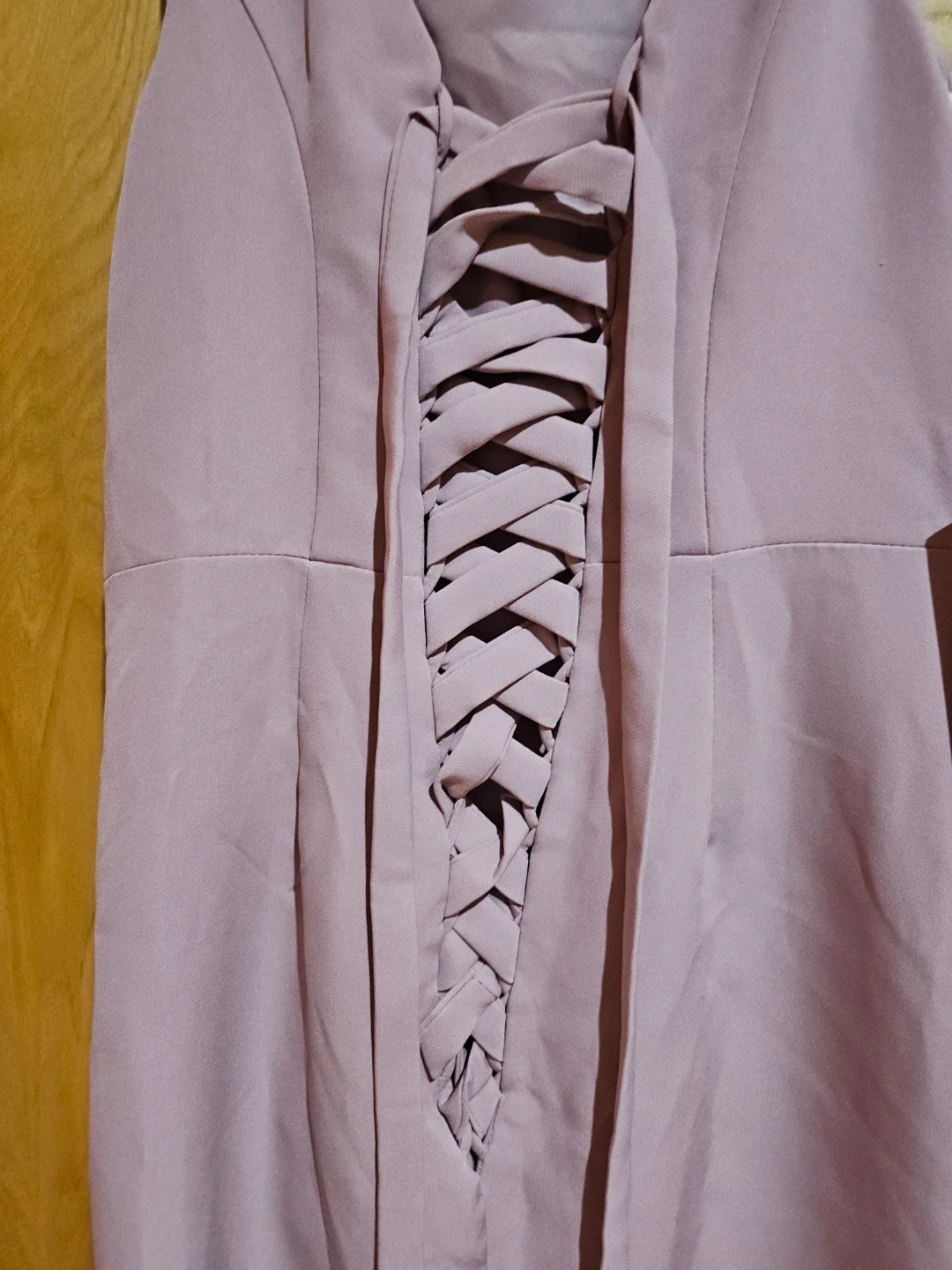 Women's sleeveless formal dress in a mauve color. It features a bow detail on the front and a lace-up back.