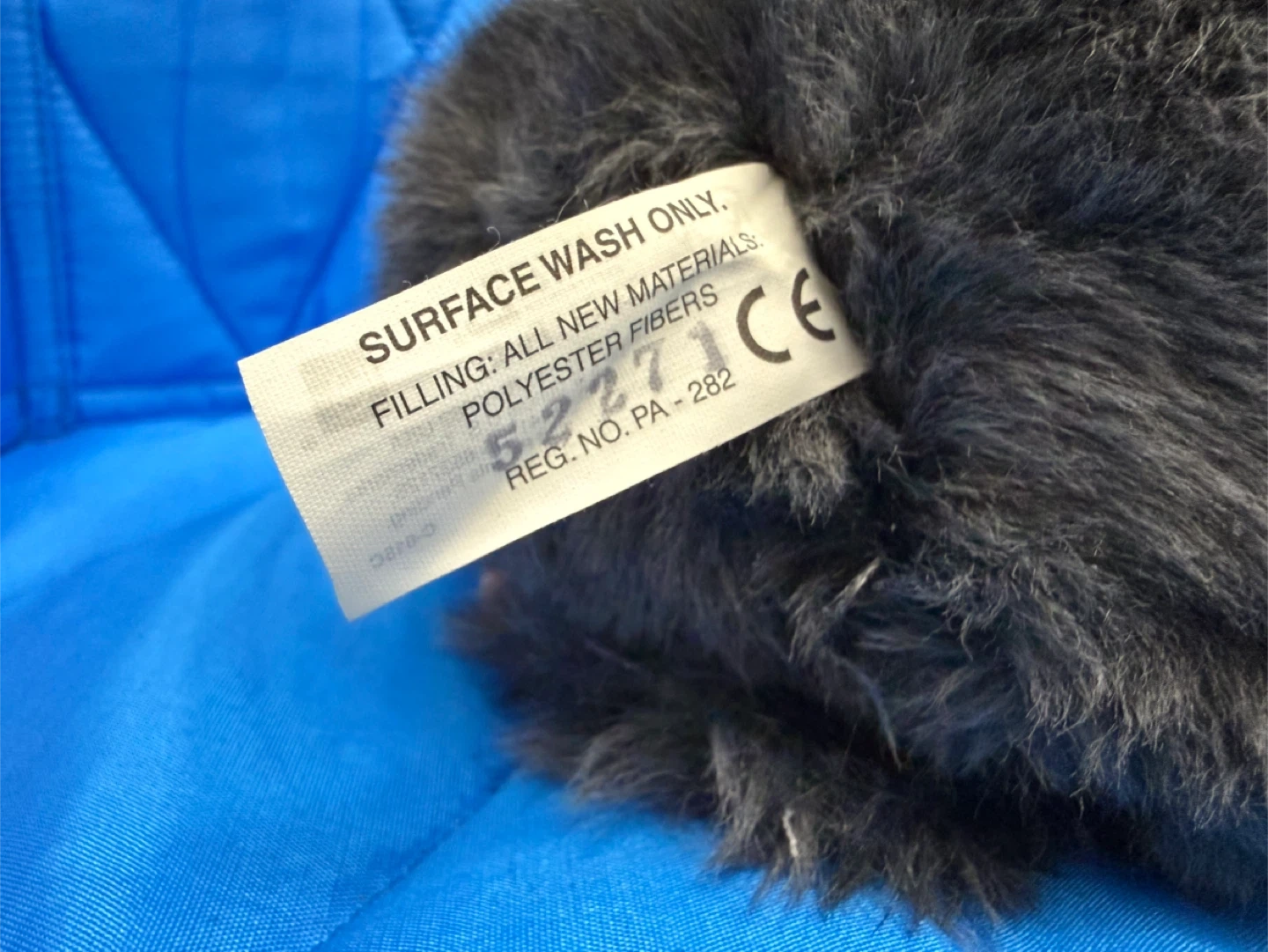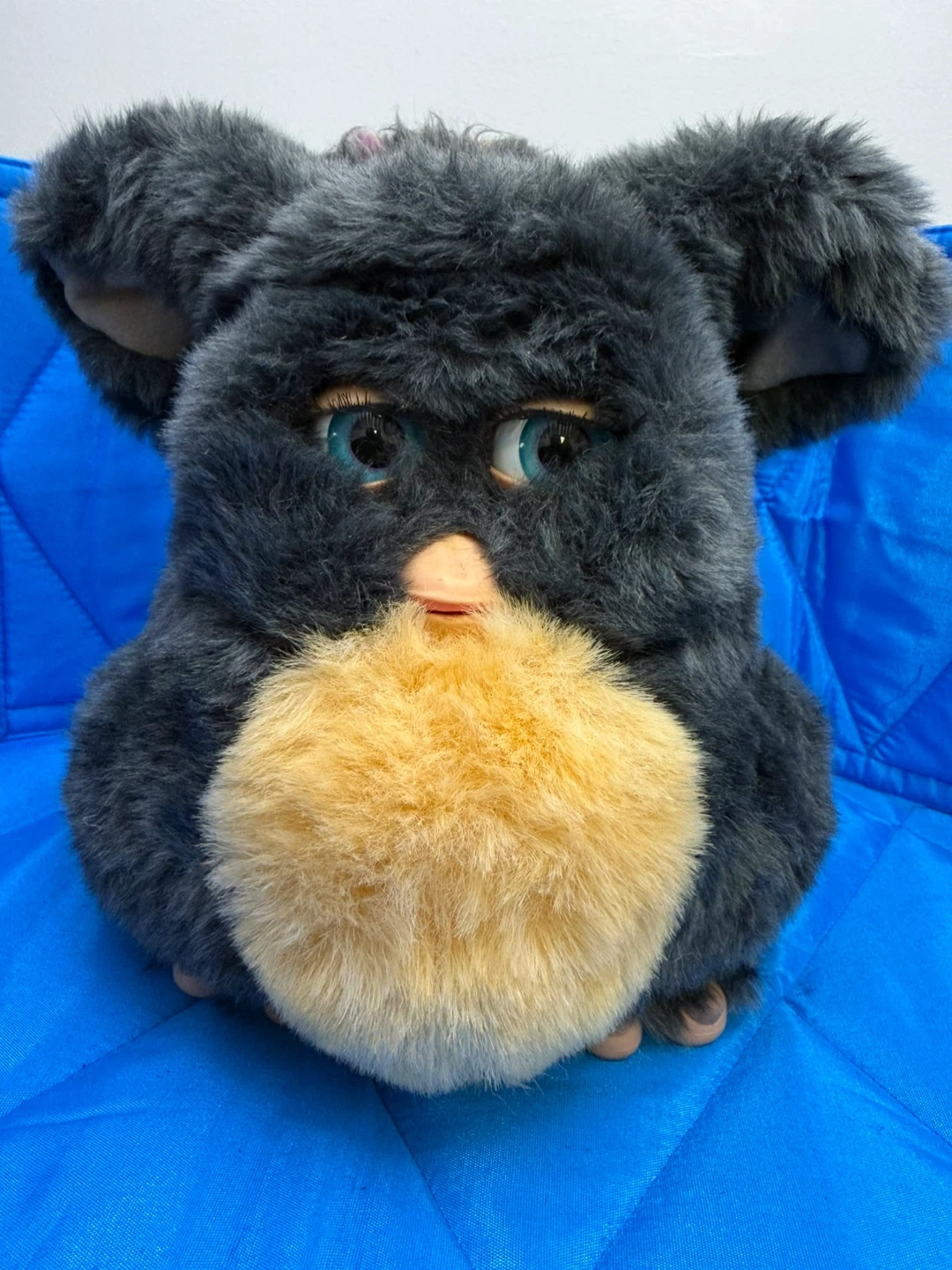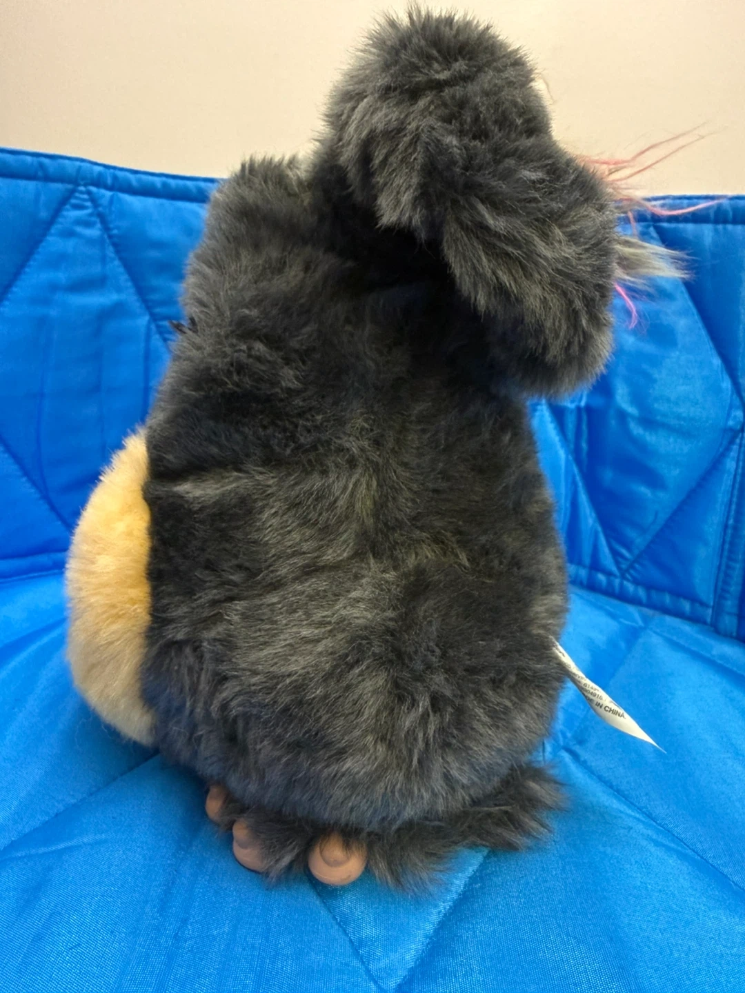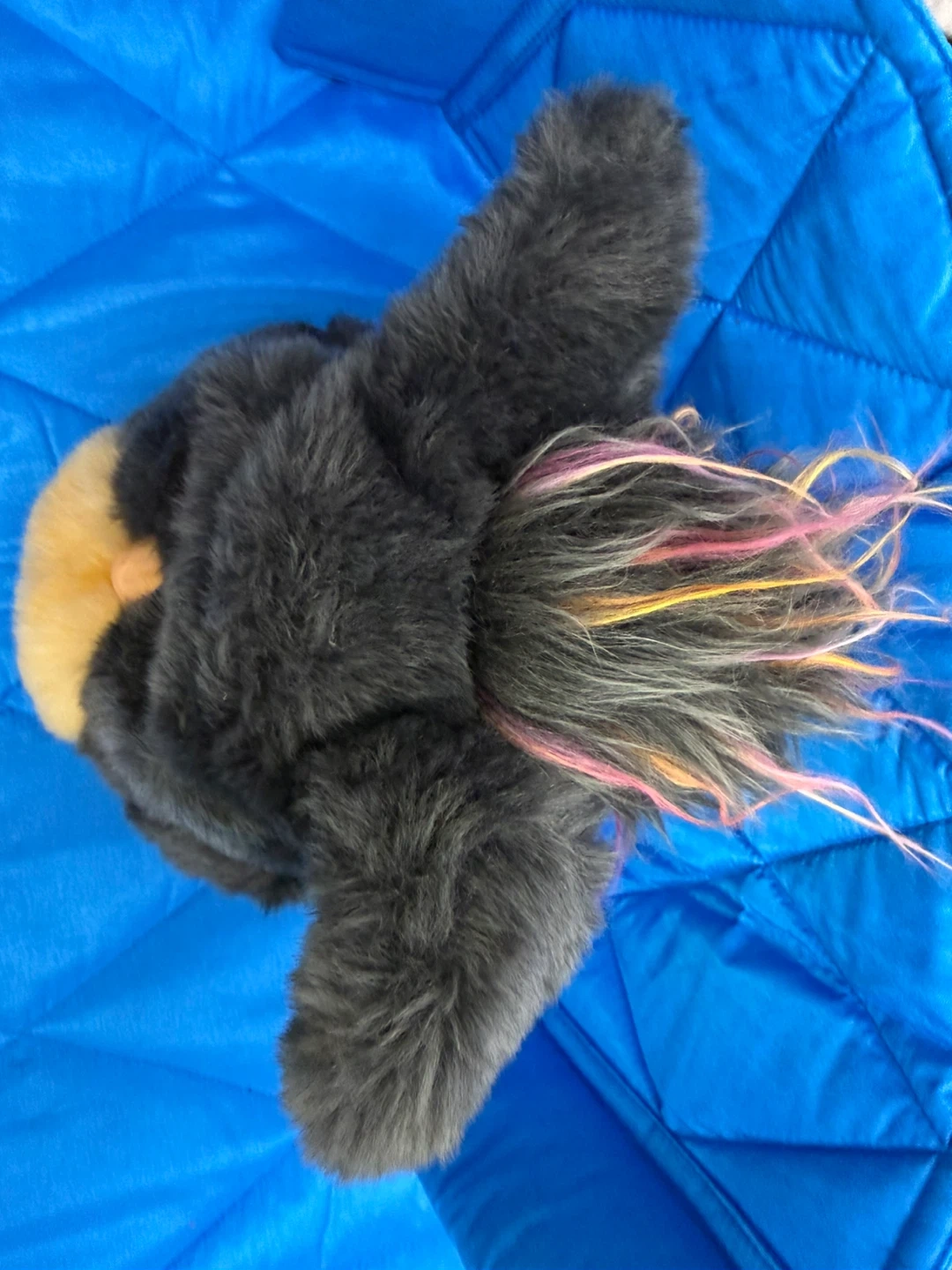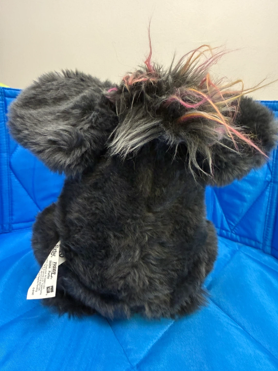 This is a gray Furby plush toy with blue eyes and a tan muzzle. It has colorful strands of pink, yellow, and gray hair on its head. This toy's fur is soft and fluffy, making it cuddly!