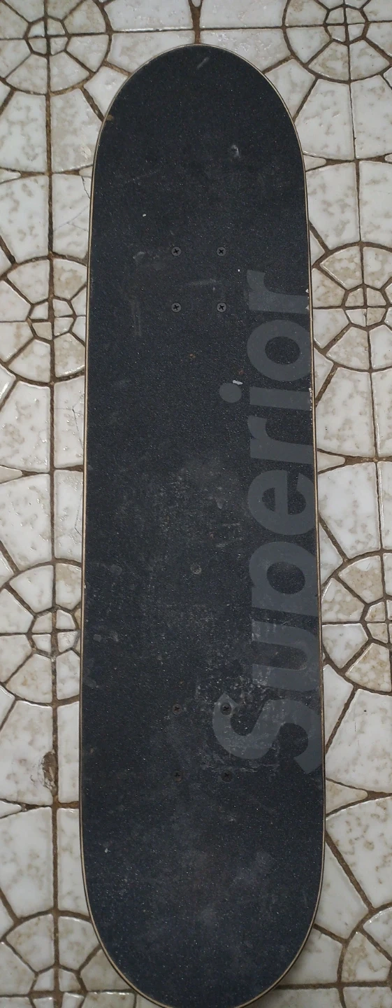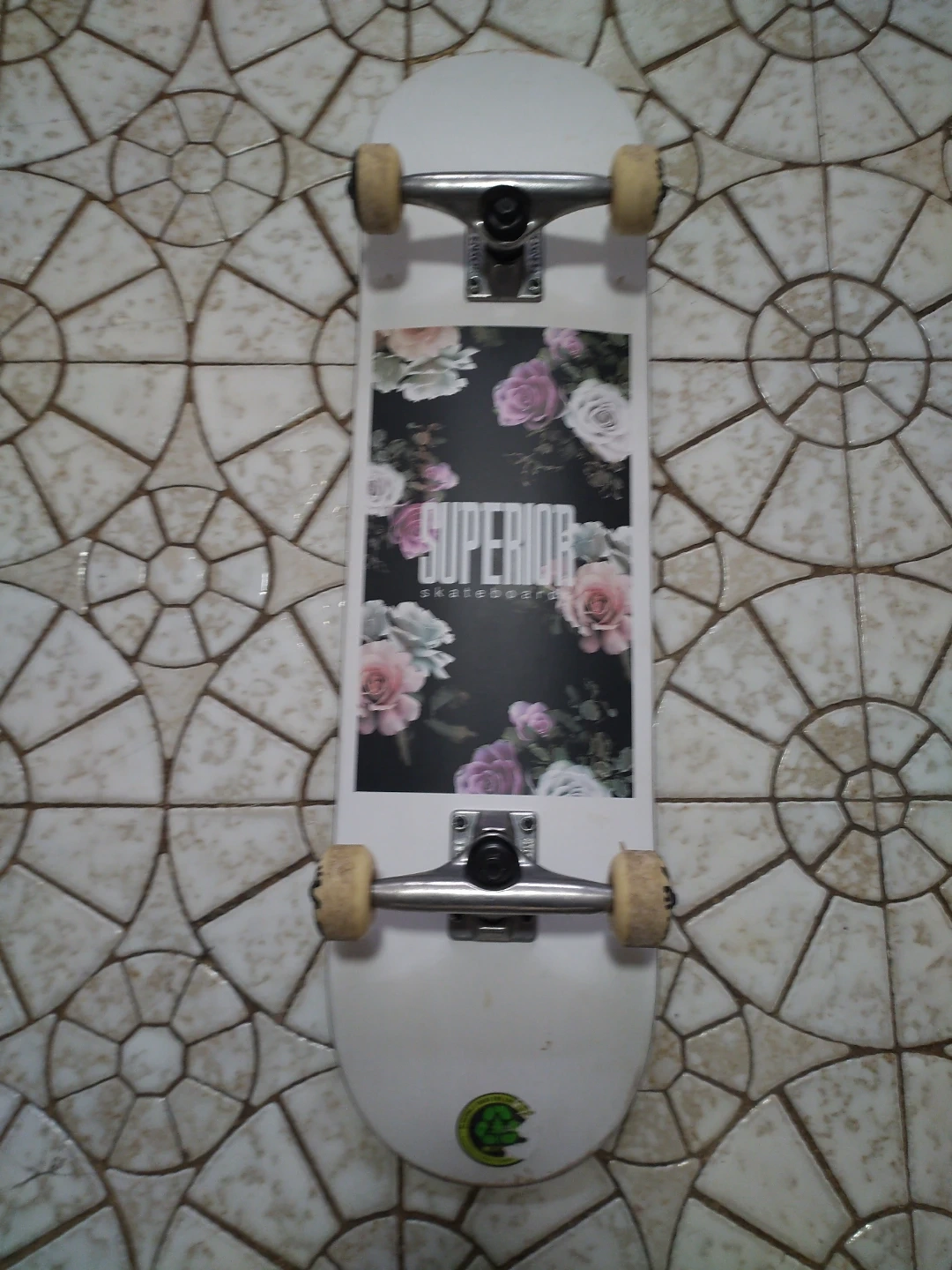 This is a complete skateboard from Superior. It has a white deck with a floral graphic. The grip tape on the bottom is black with the Superior logo. Ready for shredding!