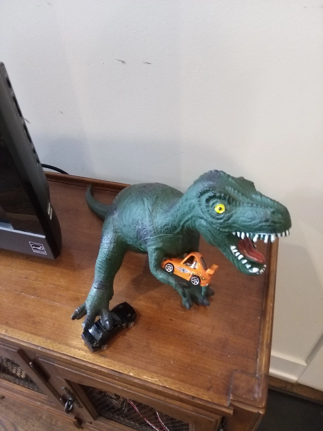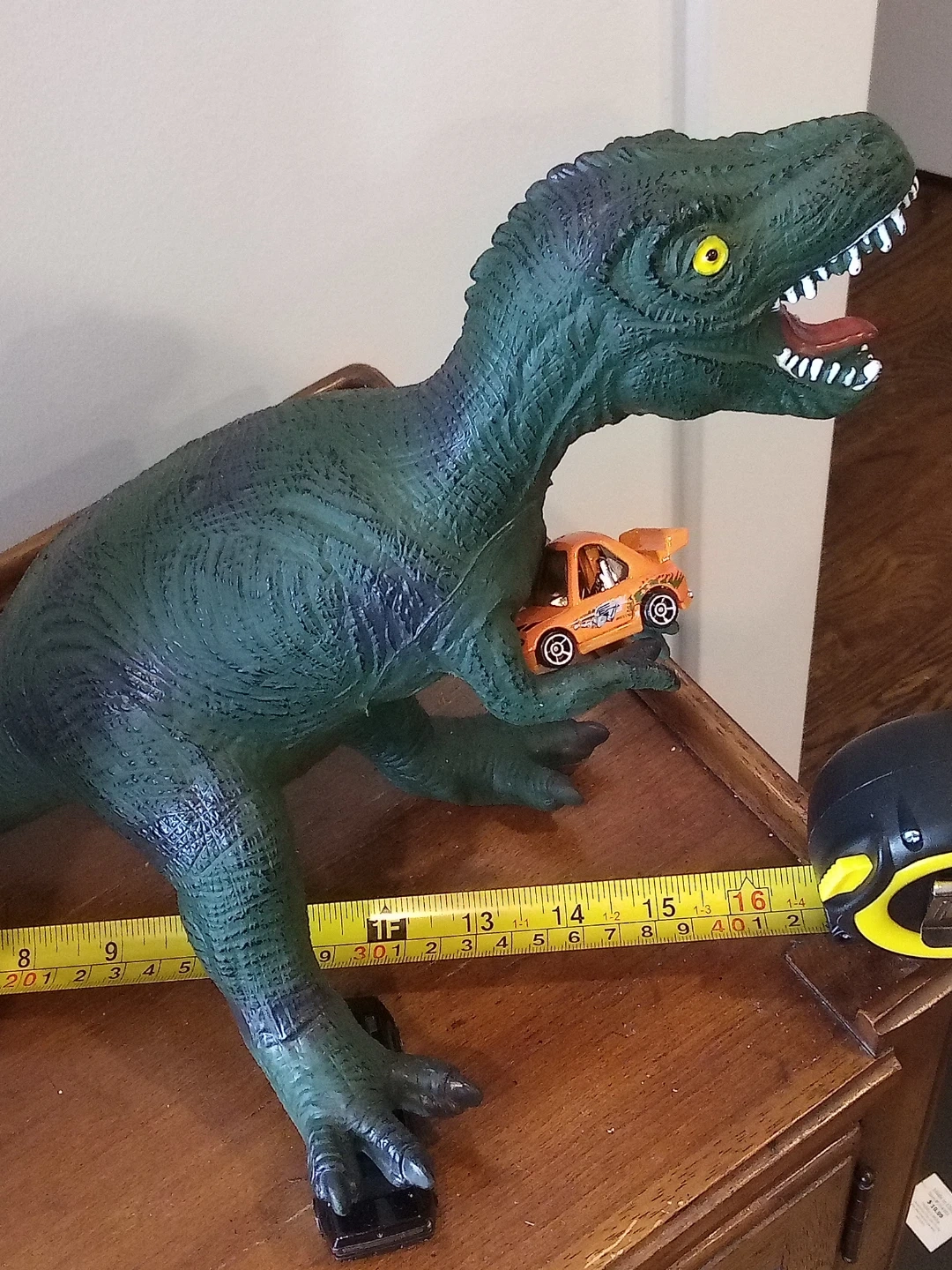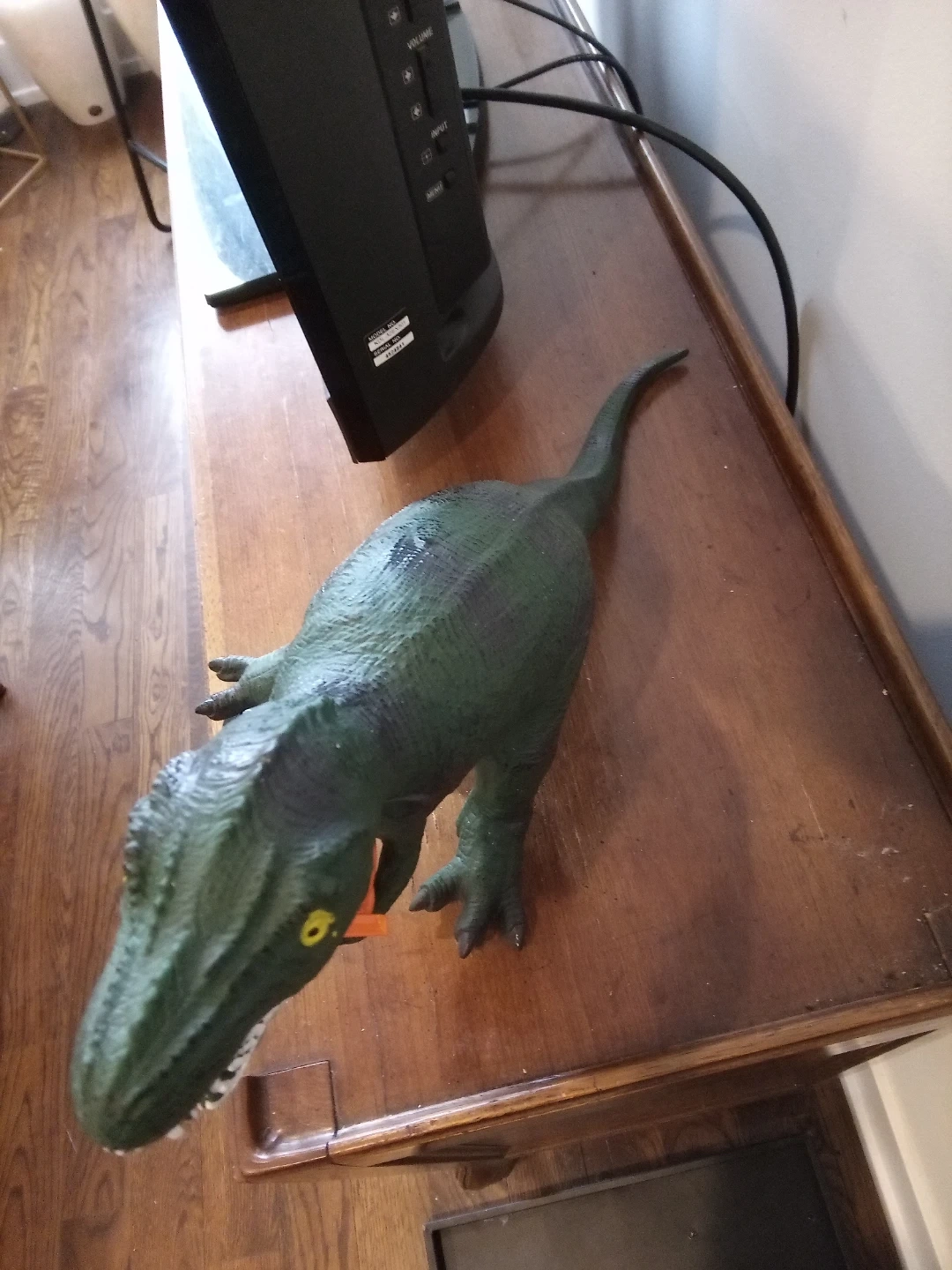 This is a green plastic dinosaur toy. It's perfect for imaginative play!