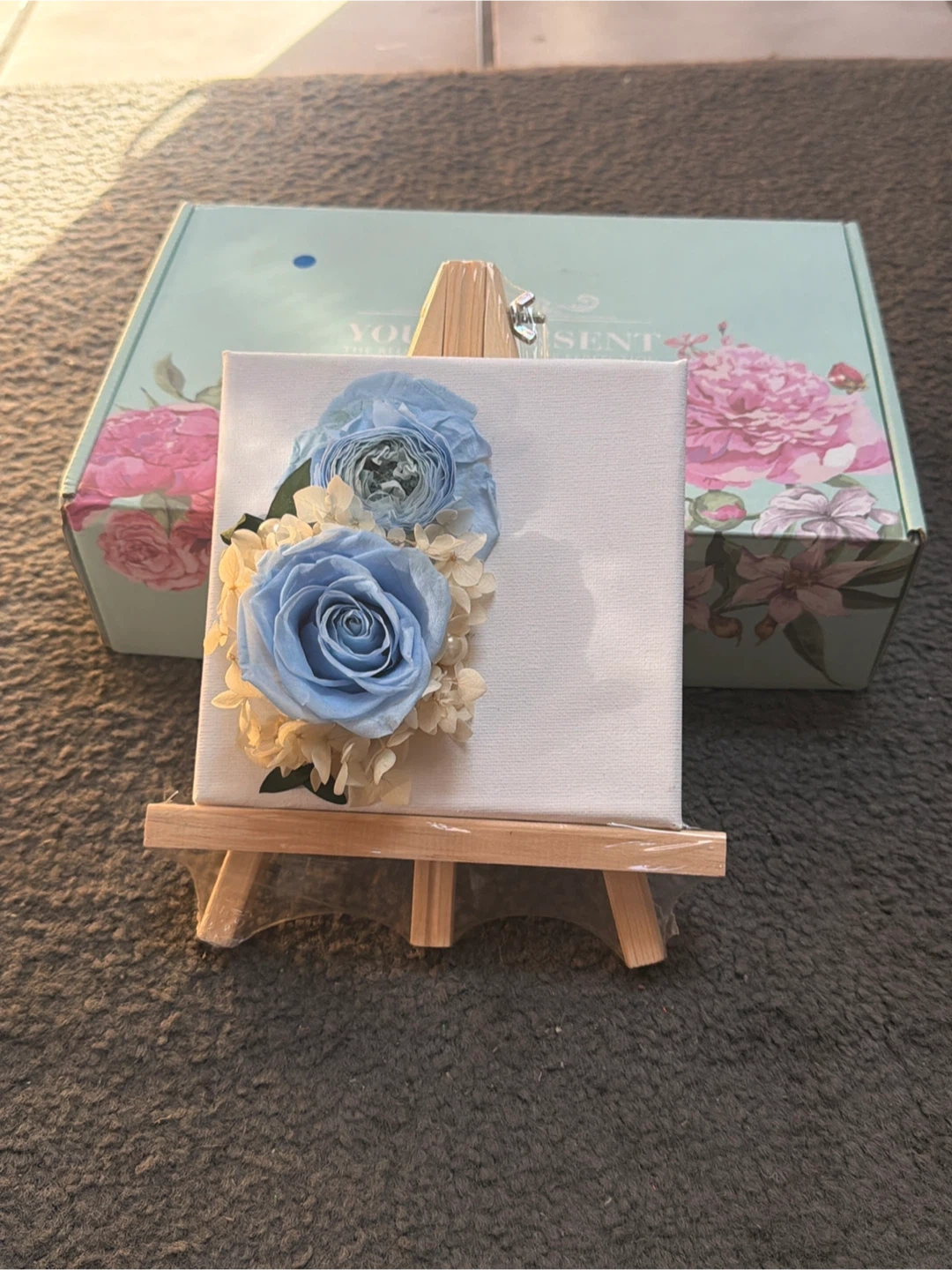 Decorative canvas featuring preserved blue roses and accents. Includes a small wooden easel for display. Comes in a floral-themed gift box. Perfect for adding a touch of everlasting beauty to any space!
