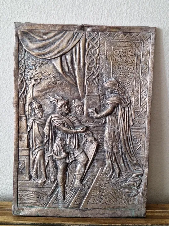 Bronze tone relief plaque depicting a scene with figures in Viking-era attire. Intricate detailing on the figures, clothing, and background elements. Suitable for wall decor.