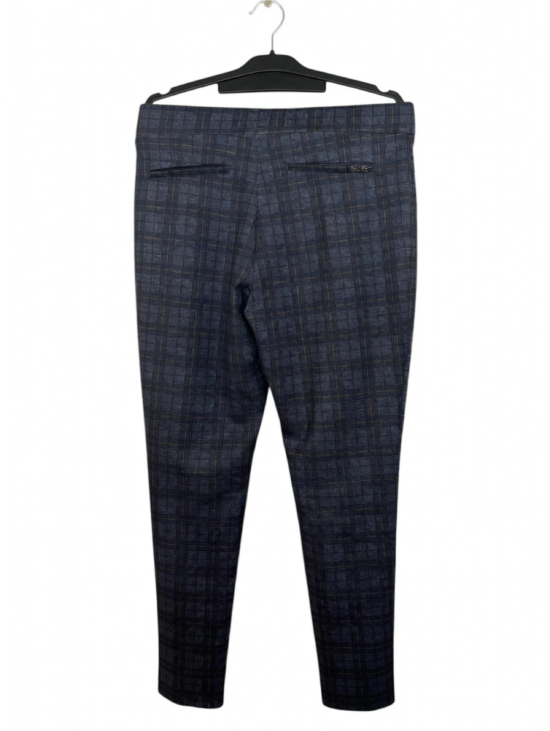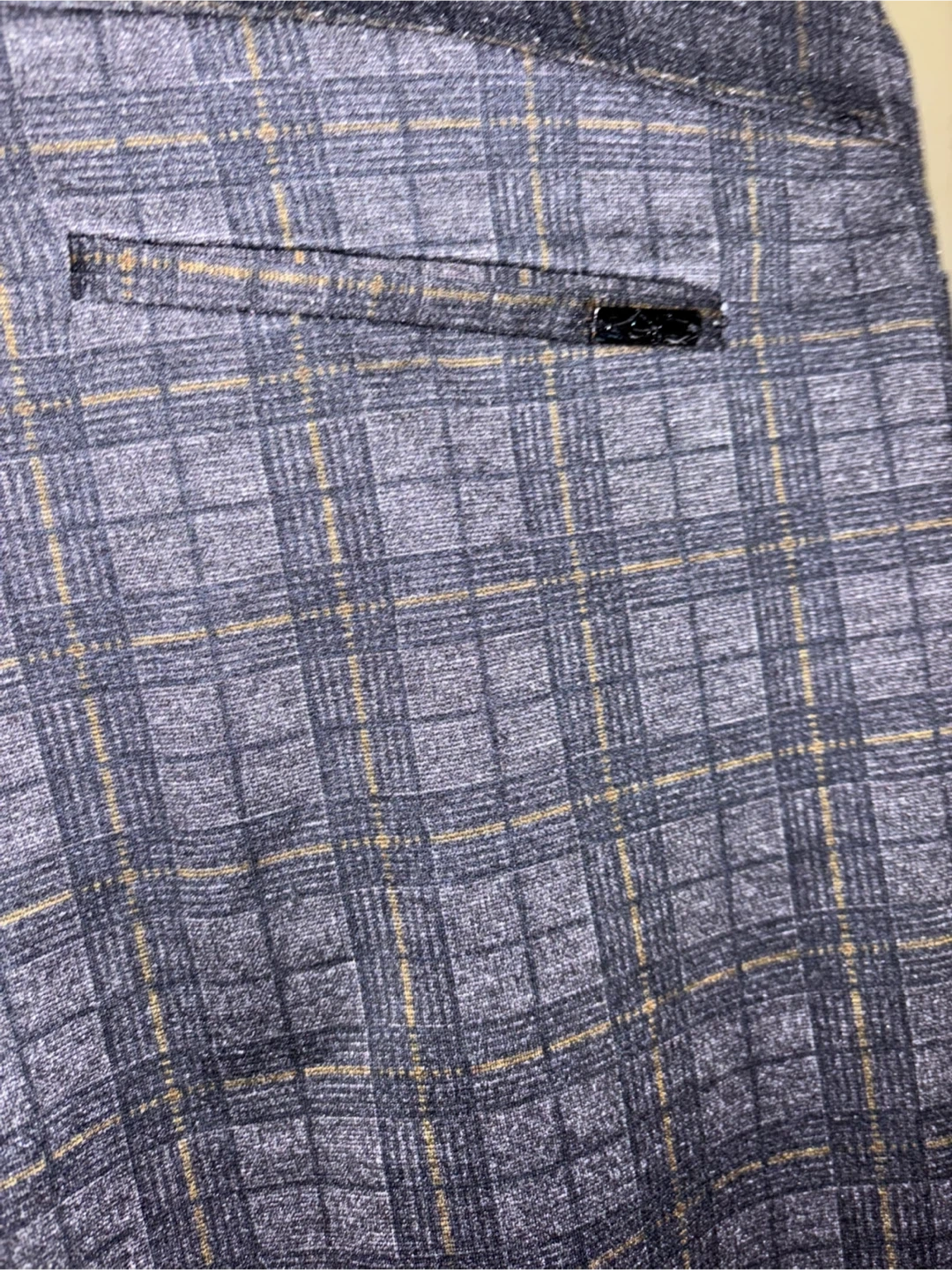 These are Calvin Klein plaid pants. They're a size 6. The fabric has a subtle yellow and blue plaid pattern.