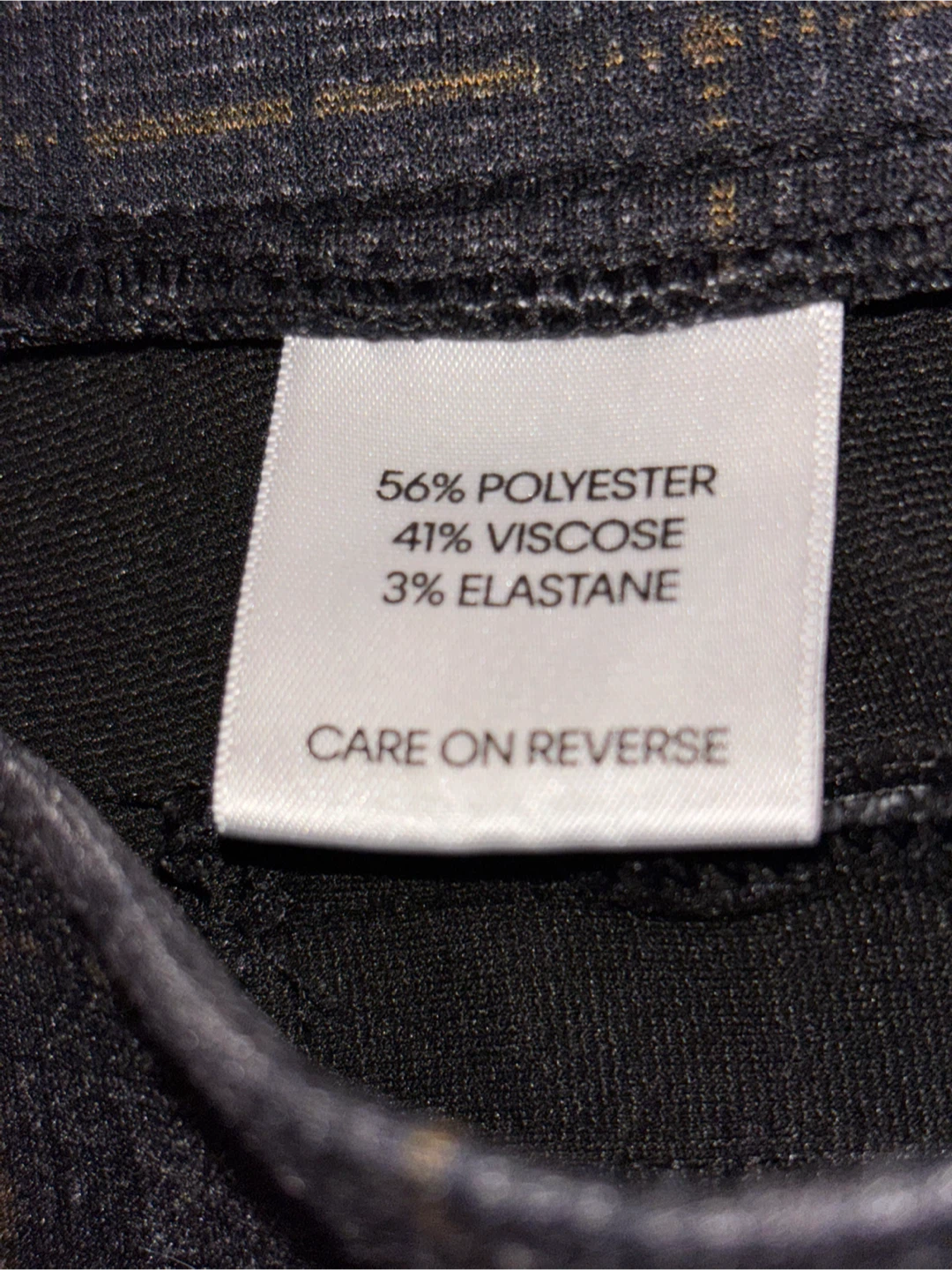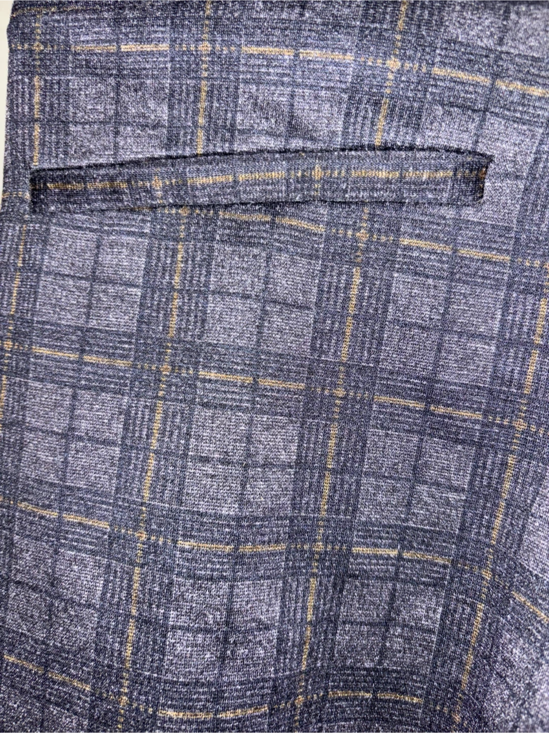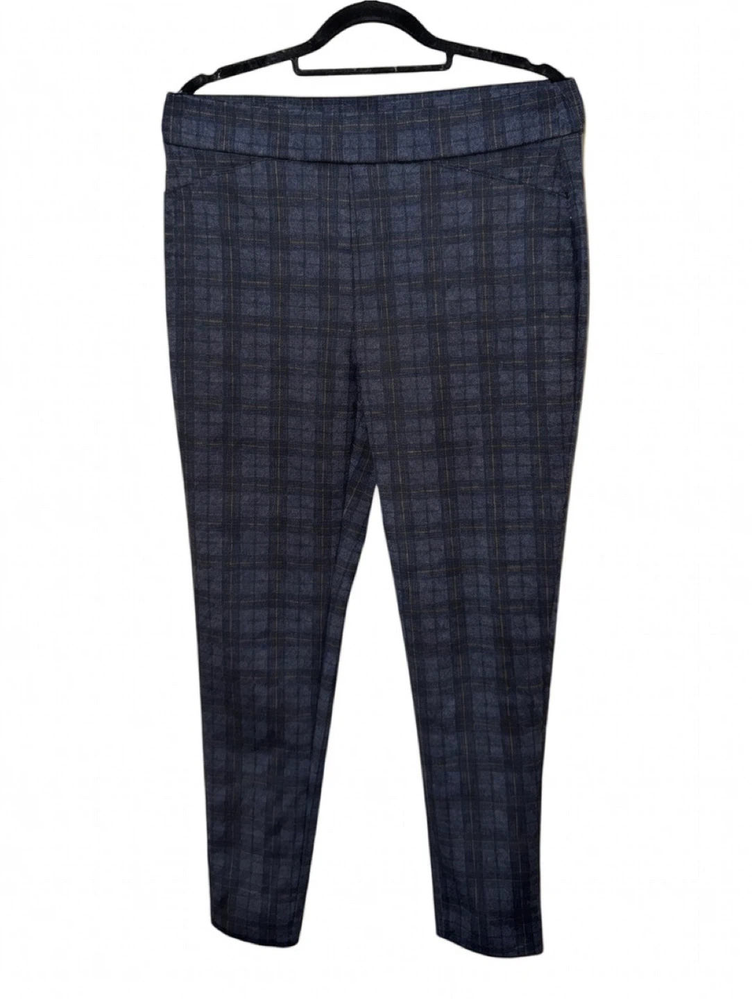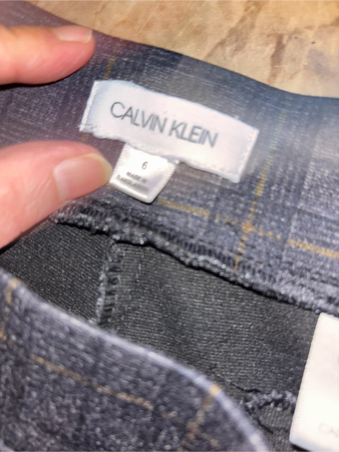 These are Calvin Klein plaid pants. They're a size 6. The fabric has a subtle yellow and blue plaid pattern.