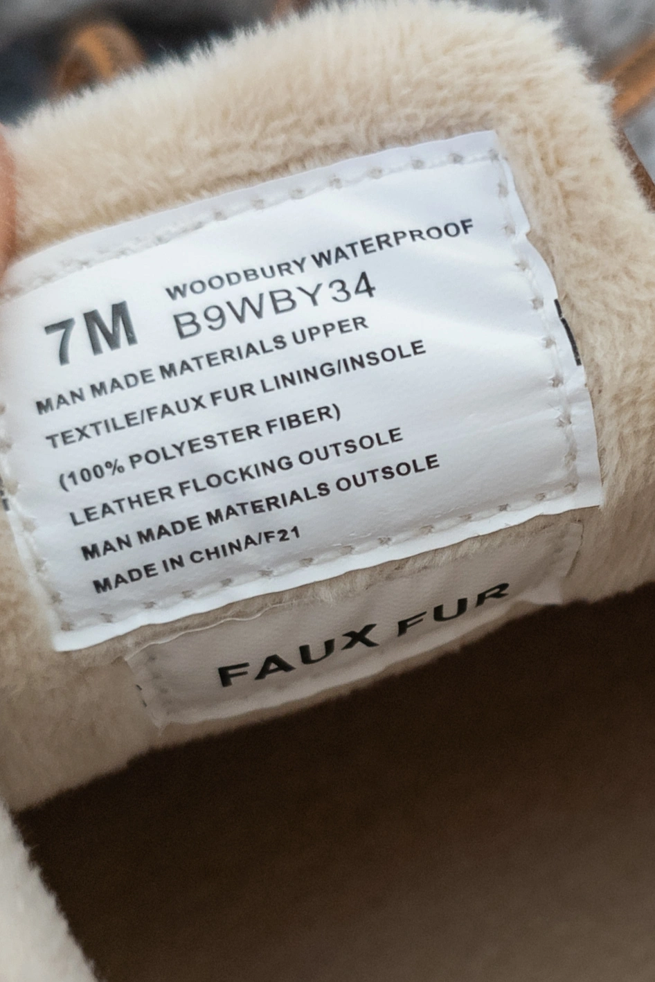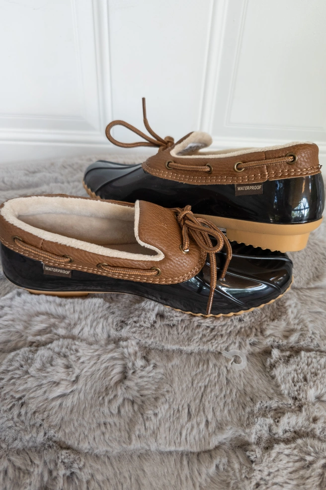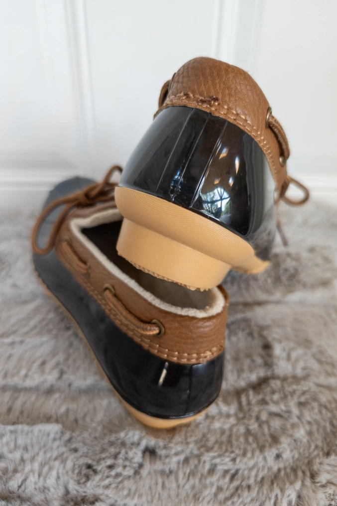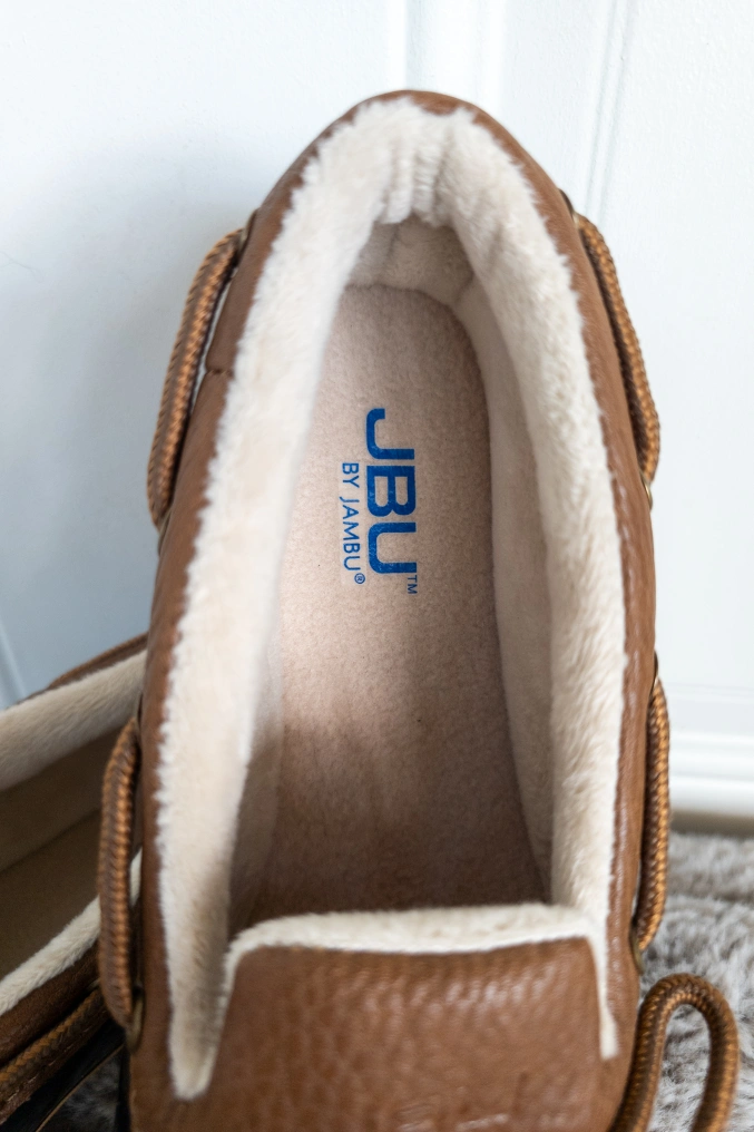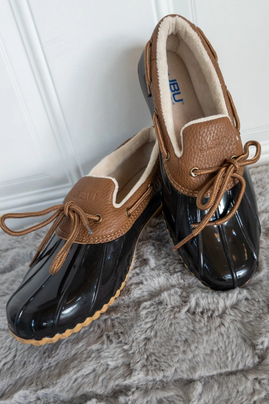 These are a pair of JBU by Jambu Woodbury waterproof duck shoes. They are size 7M-7.5 and feature a man-made upper with textile/faux fur lining and insole. The outsole is leather flocking. They're perfect for keeping your feet dry and cozy!NEW