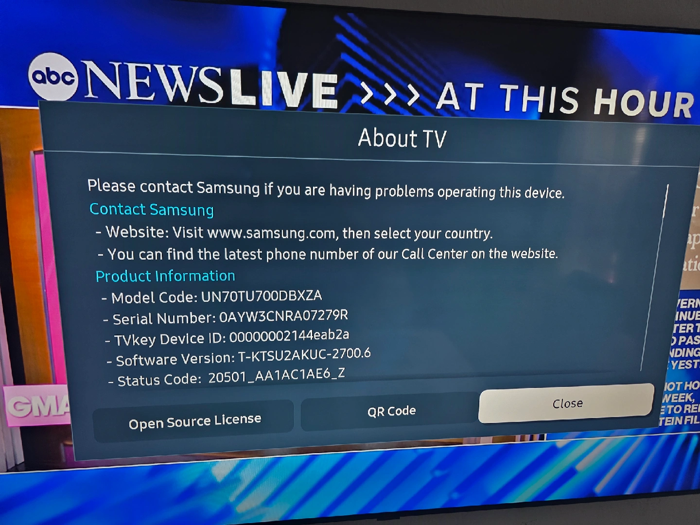 Selling a Samsung 70-inch TV. The model number is UN70TU700DBXZA. Software Version: T-KTSU2AKUC-2700.6, Status Code: 20501_AA1AC1AE6_Z