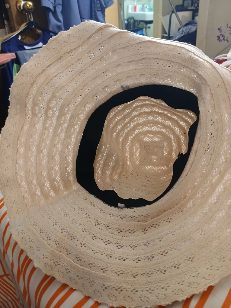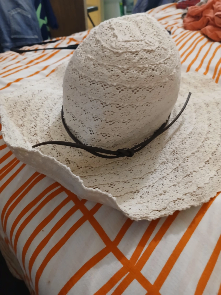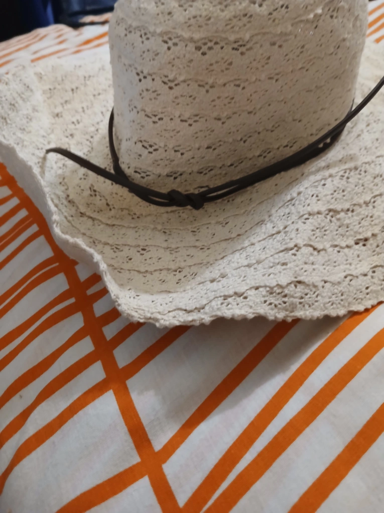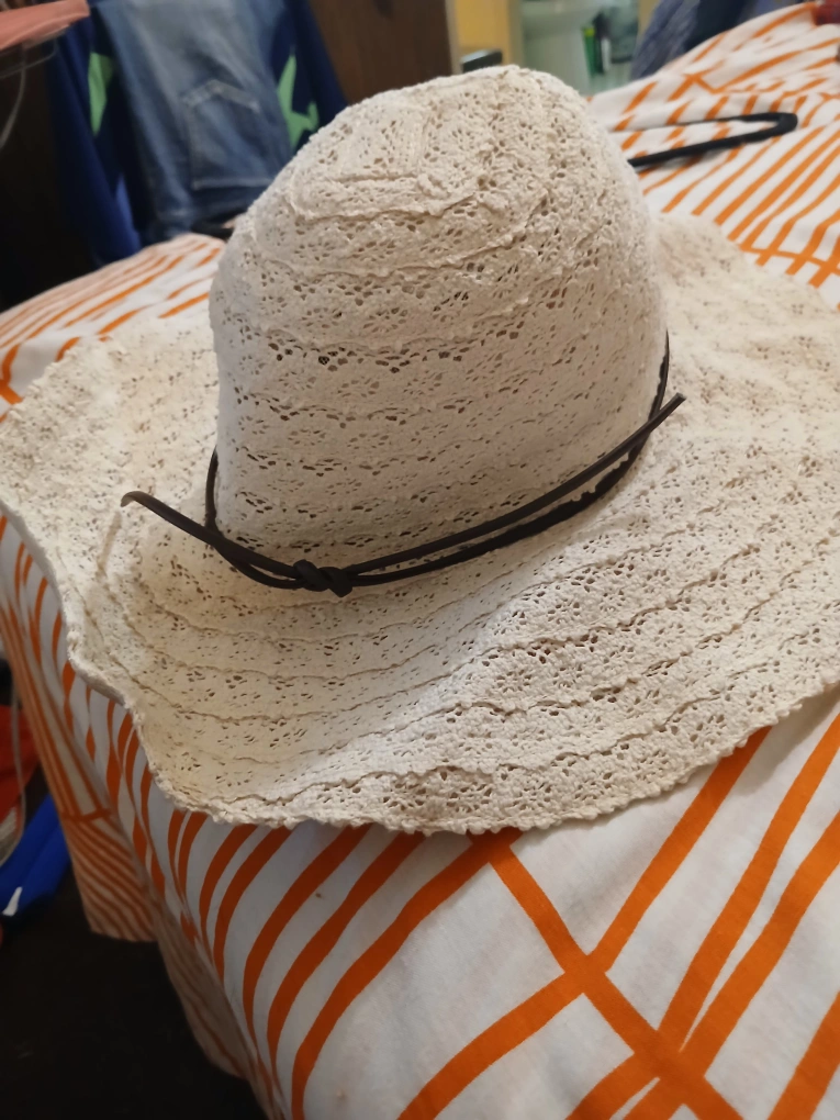 Selling a cream-colored crochet sun hat! It features a stylish brown band around the base of the crown. Perfect for sunny days and adding a touch of flair to your outfit