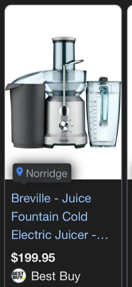 This is a Breville Juice Fountain Cold electric juicer. It features a wide chute for easy feeding and a powerful motor. Includes a large pulp bin and juice pitcher for continuous juicing.