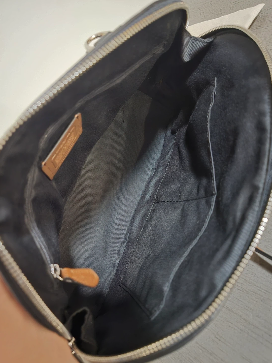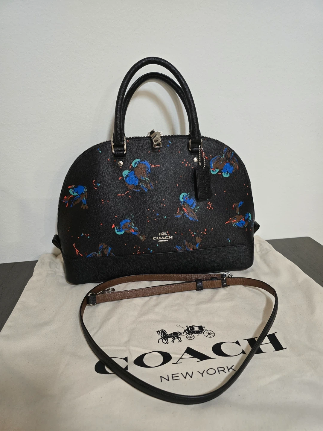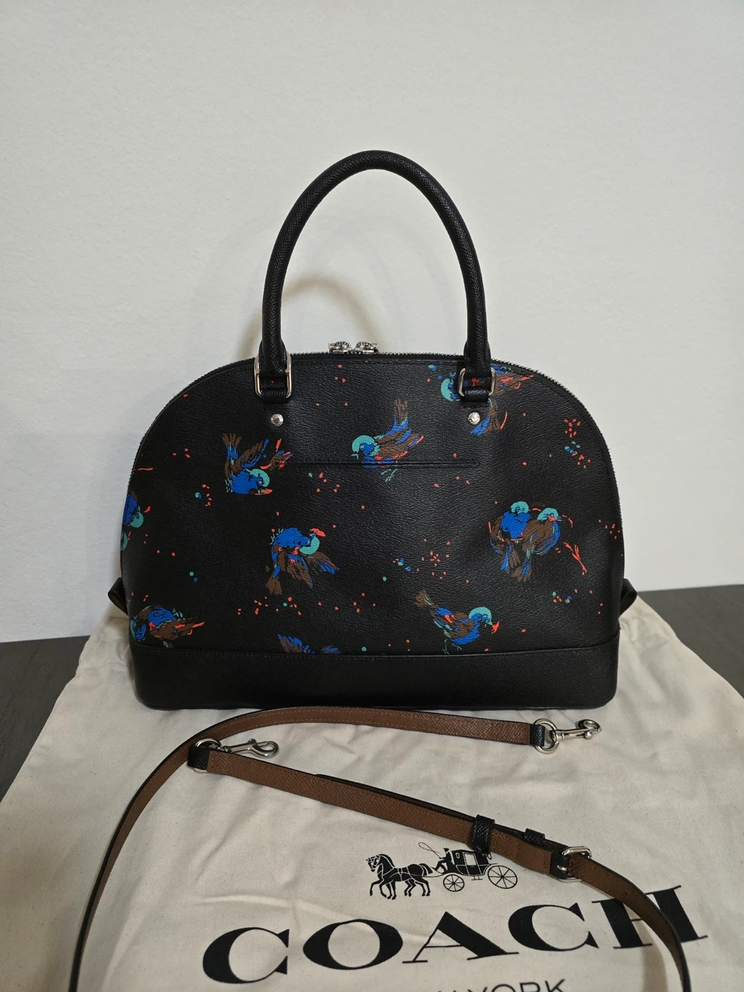 This Coach dome satchel features a charming bird print on black leather. It has a zip-top closure and a detachable strap. Includes dust bag. Two interior pockets.