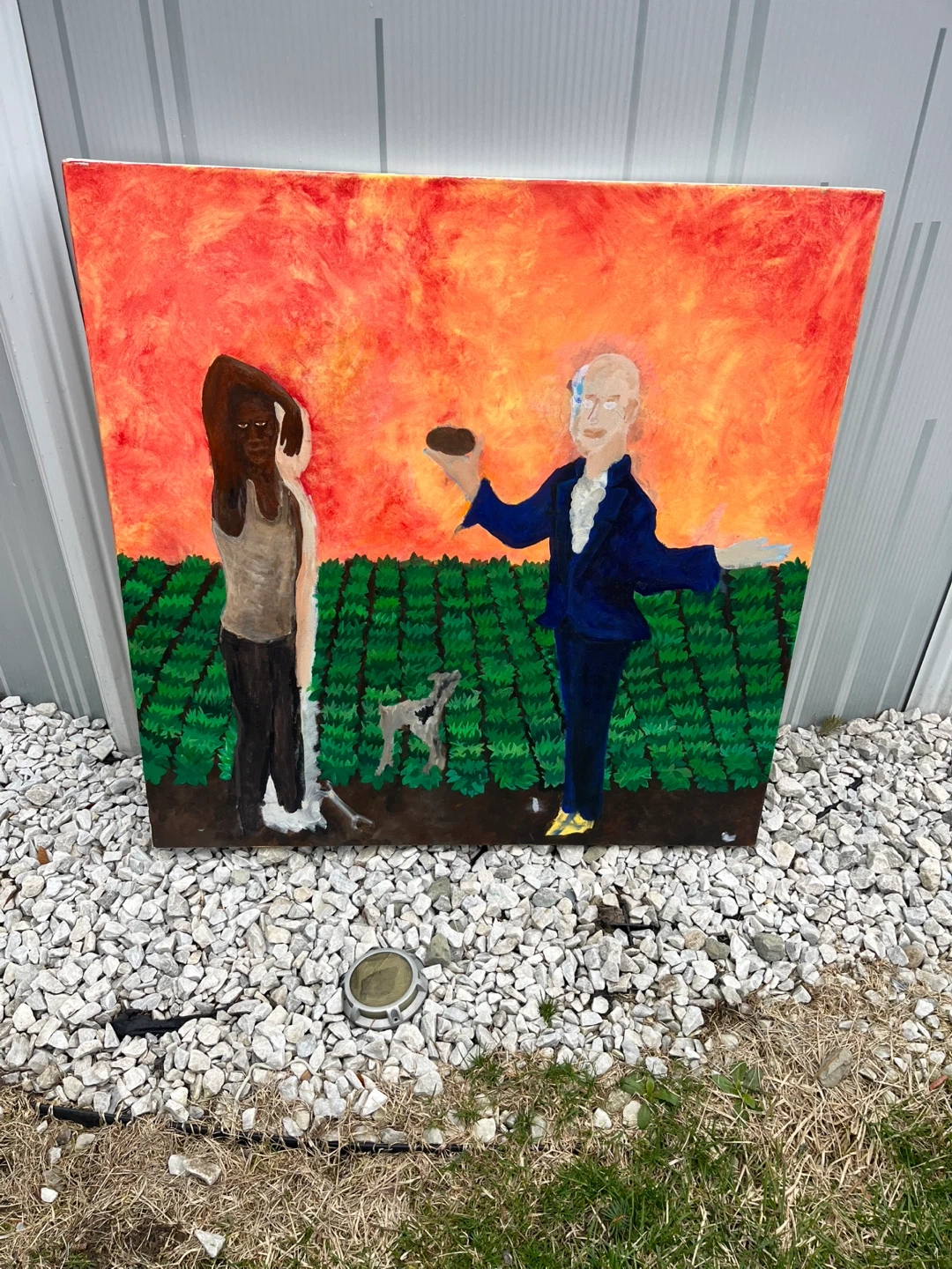 Acrylic painting on canvas depicting two figures in a field, one in casual attire and the other in a suit holding a coffee bean. A dog is also present in the scene. The background features a vibrant, abstract orange and red sky.