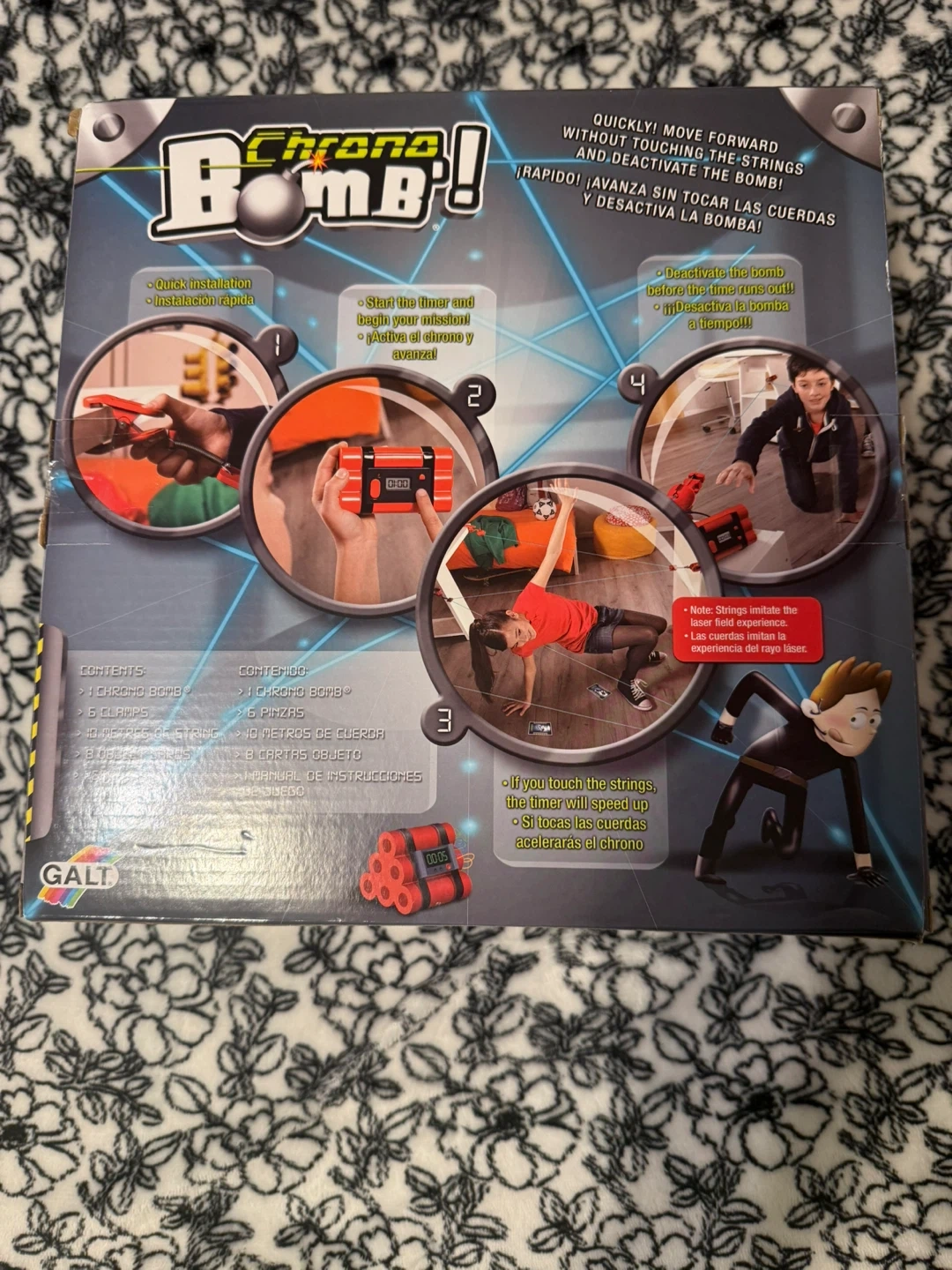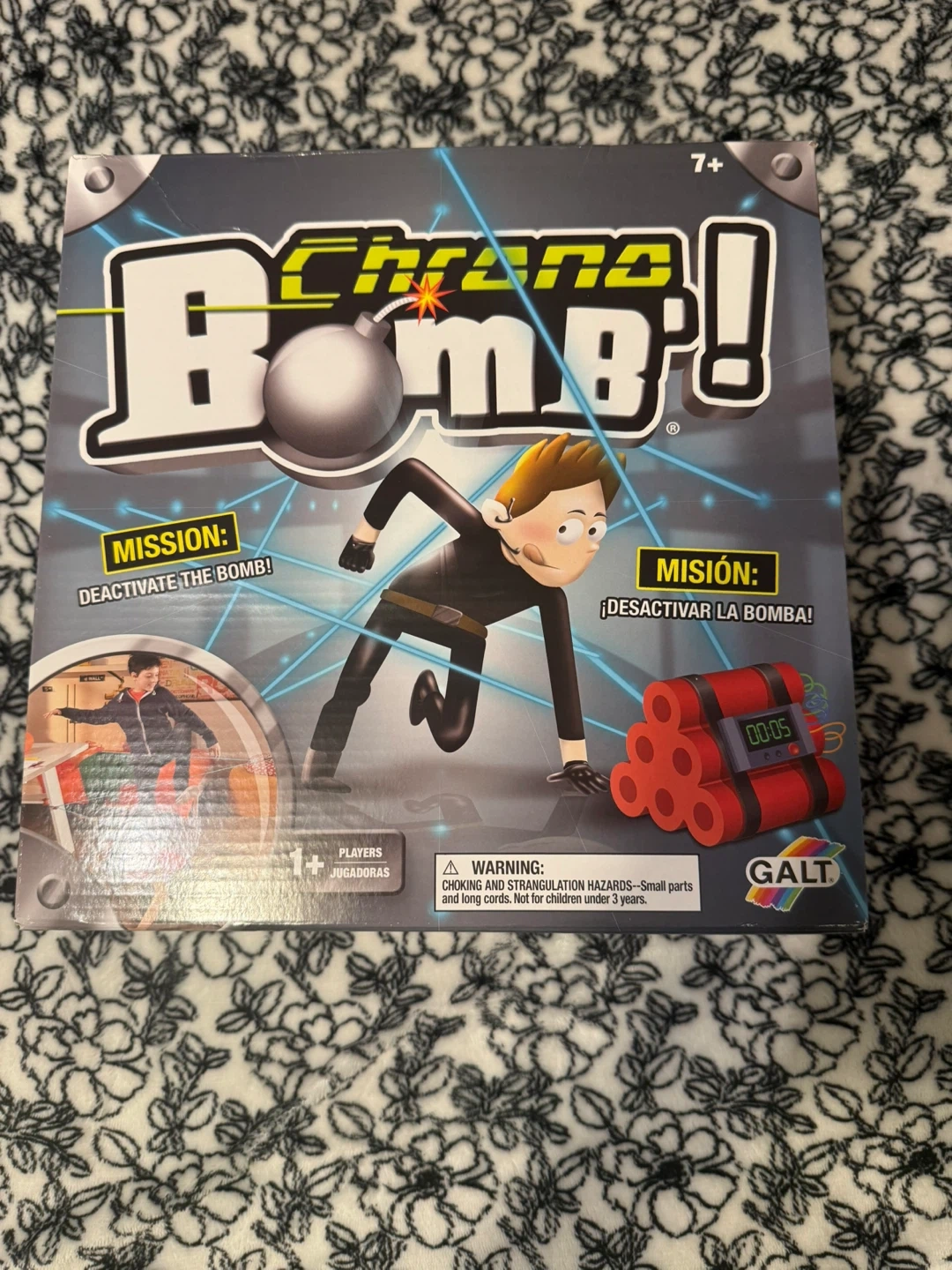 It's the Chrono Bomb! board game where players race against time to deactivate the bomb. This game is for ages 7 and up. Includes bomb, laser field, mission cards, and instruction manual.