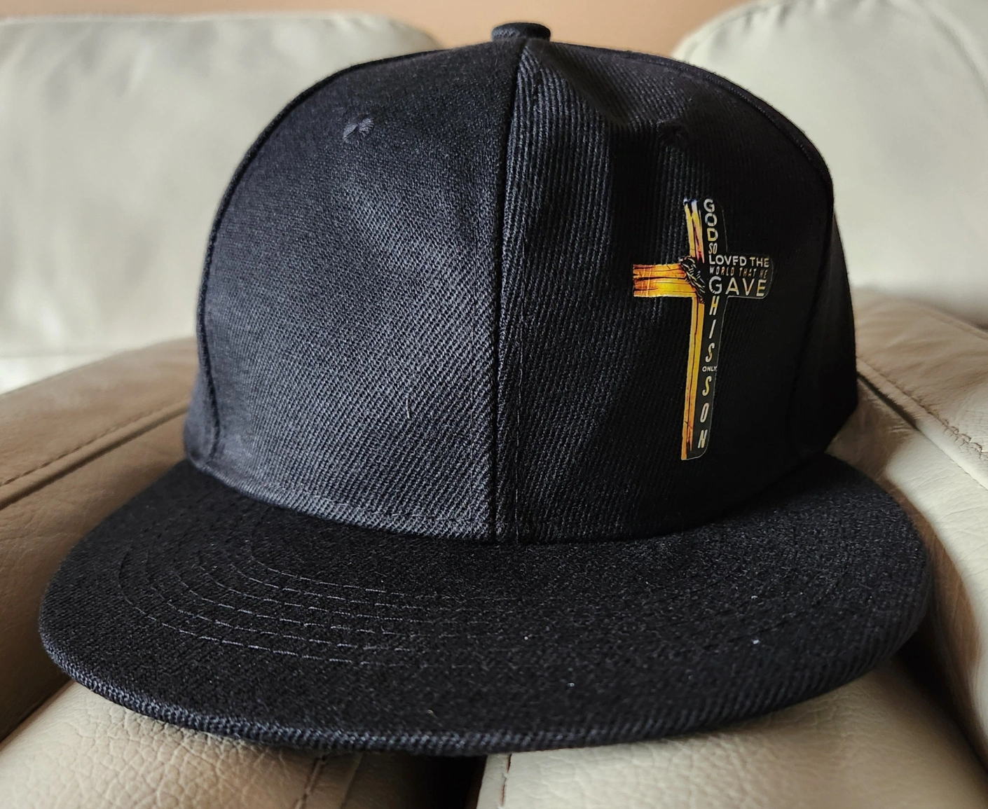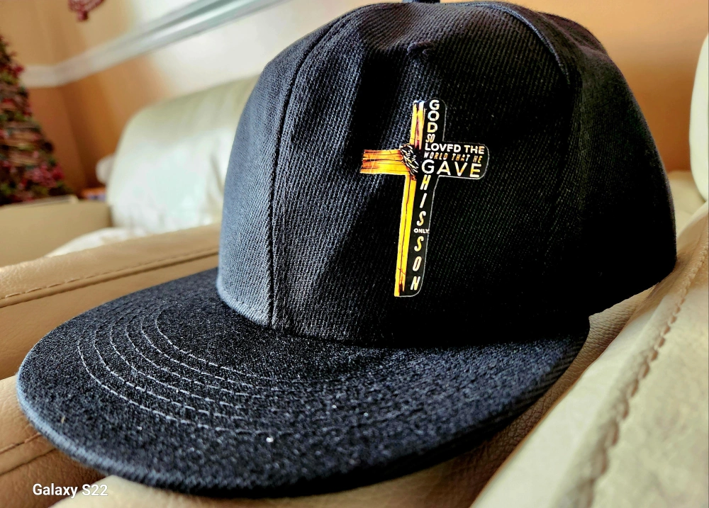 Adjustable "John 3:16"black Snapback hat. Features a graphic of a cross with a bible verse. Good condition.