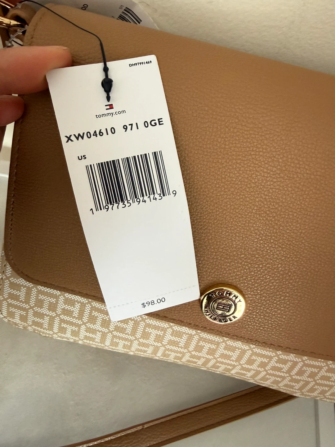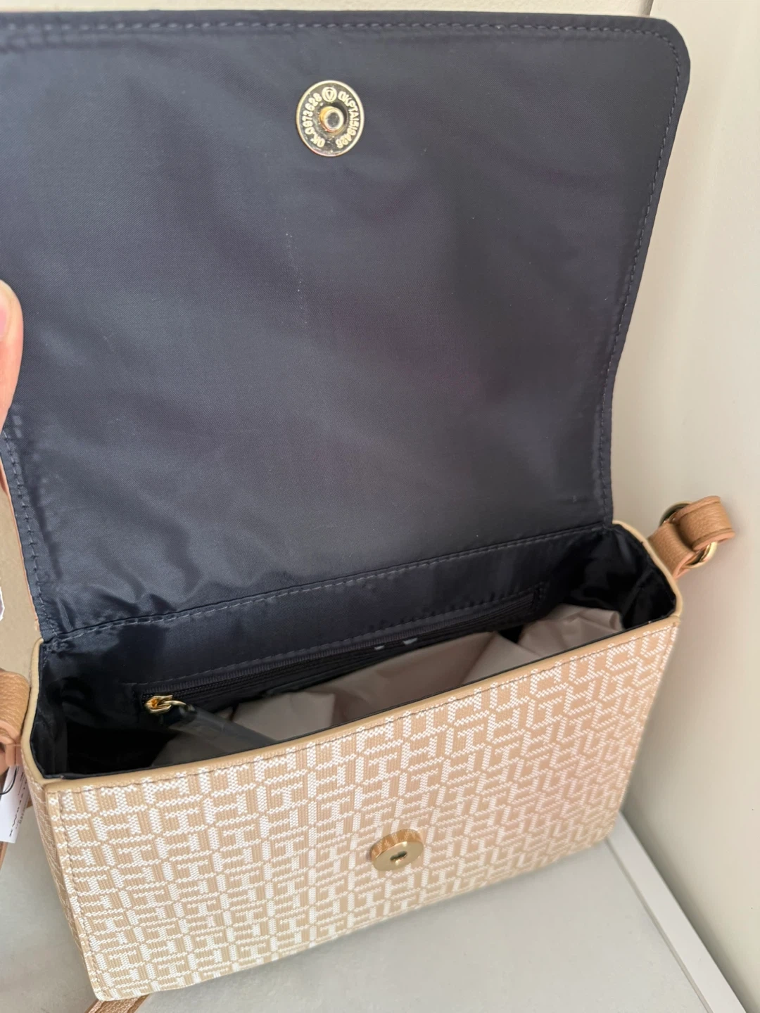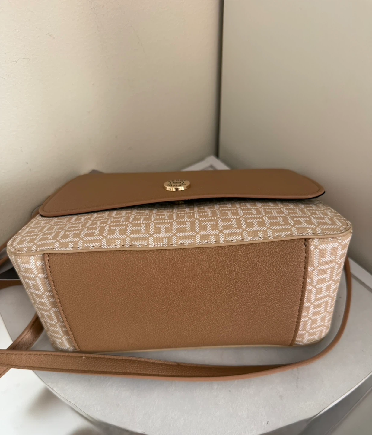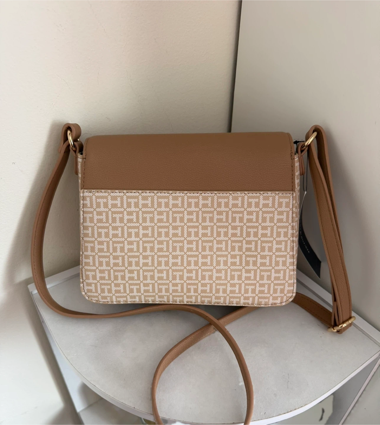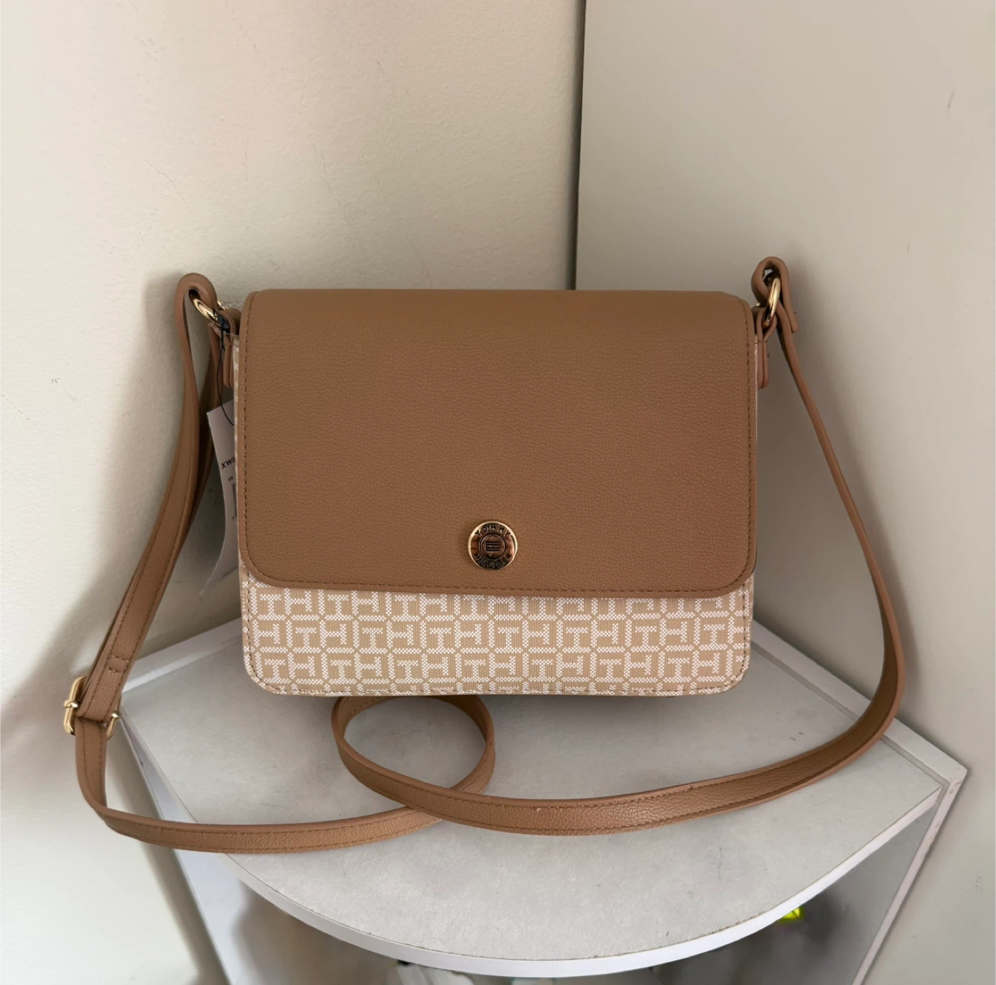 This is a stylish Tommy Hilfiger crossbody bag. It features a tan and beige color scheme with the brand's signature pattern. The bag has a secure flap closure and a durable strap.