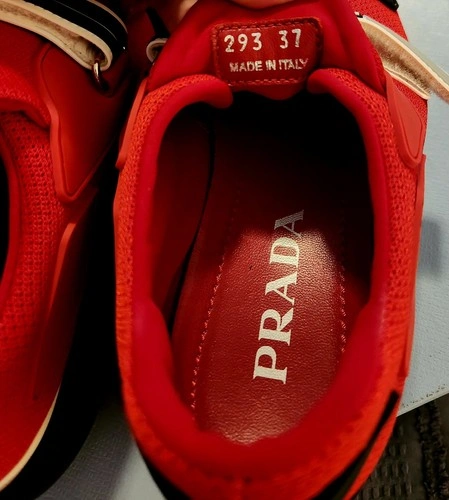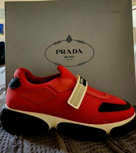 These PRADA Sneakers Bike Cloudbust in red, white, and black are a stylish and high-quality choice for women looking for a versatile athletic shoe. Made in Italy with high-tech textile fabrics and a rubber outsole, these sneakers offer both comfort and durability. The iconic Prada Cloudbust model, featuring a standard shoe width and a sleek sneaker style, is perfect for those looking to make a statement with their footwear. In mint condition!