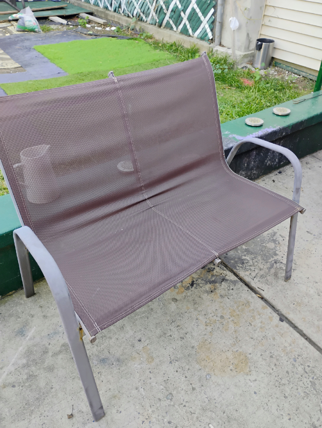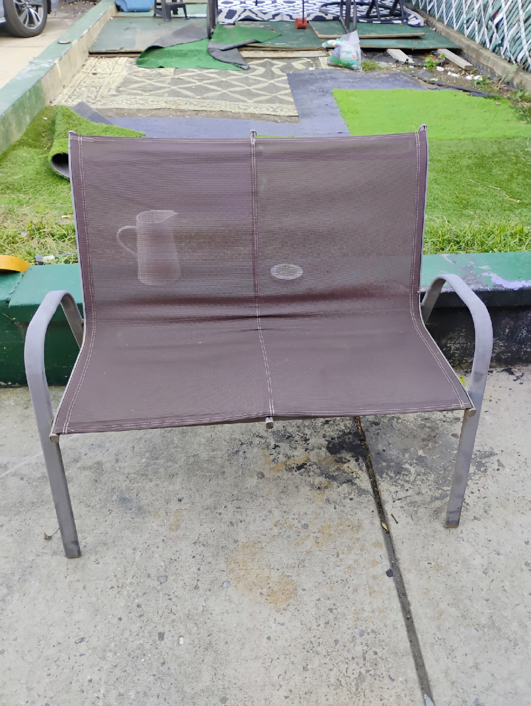 Selling a brown outdoor patio loveseat. It's in good condition and perfect for relaxing outside on your porch or patio. The frame is metal, and the seat is a mesh fabric.