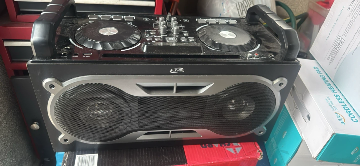 This LIVE brand DJ controller speaker system features two turntables, a mixer section, and large front-facing speakers. It's a portable unit designed for parties or practicing DJ sets. The unit appears to have USB and aux inputs.