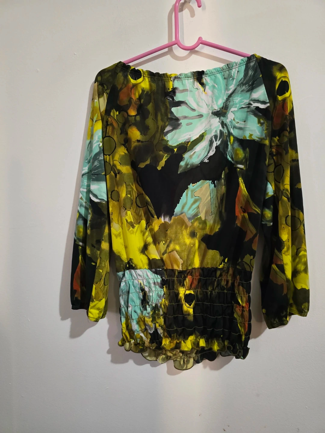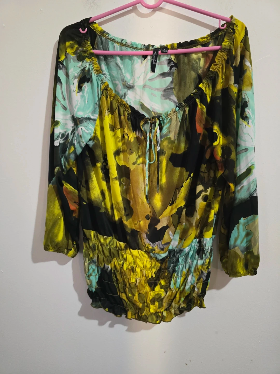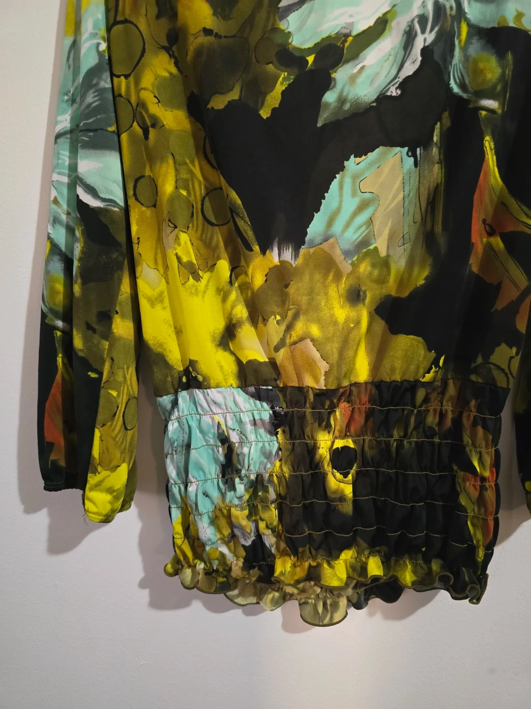 This long-sleeved blouse features a vibrant abstract print with a mix of yellow, black, and teal. It has a drawstring tie neckline and a smocked waist for a flattering fit. The material is lightweight and airy, making it comfortable for warmer weather.